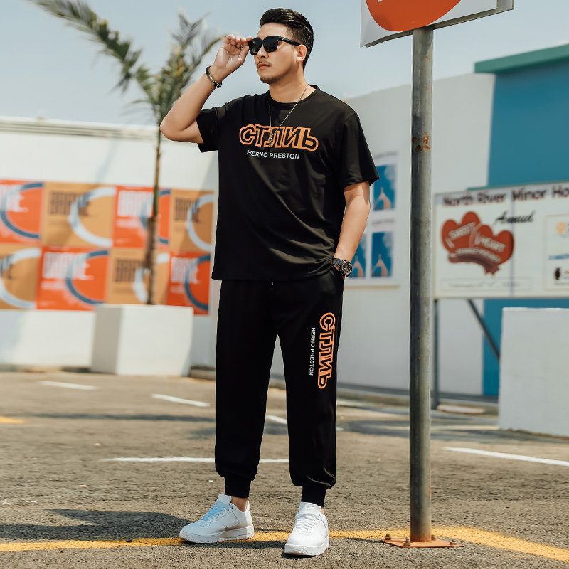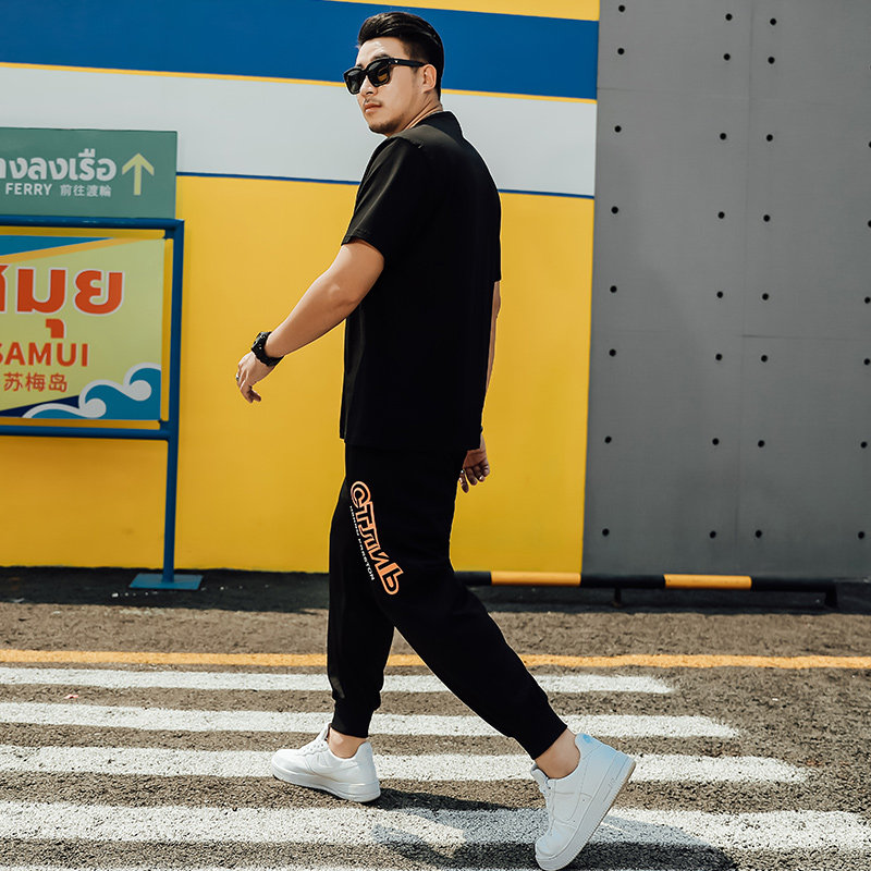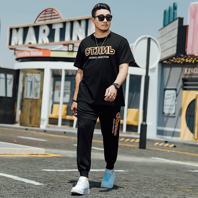 Plus fat plus size short-sleeved t-shirt men's trendy fat summer loose casual sports suit with feet and pants 200 catties