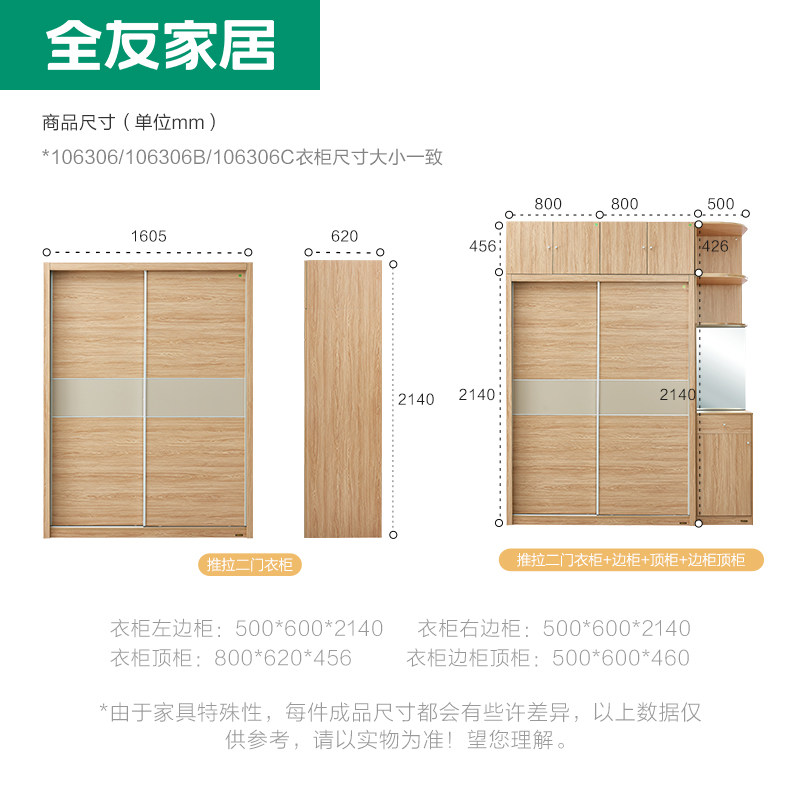 Quanyou home modern simple bedroom household storage sliding door two-door wardrobe assembly top cabinet side cabinet 106306