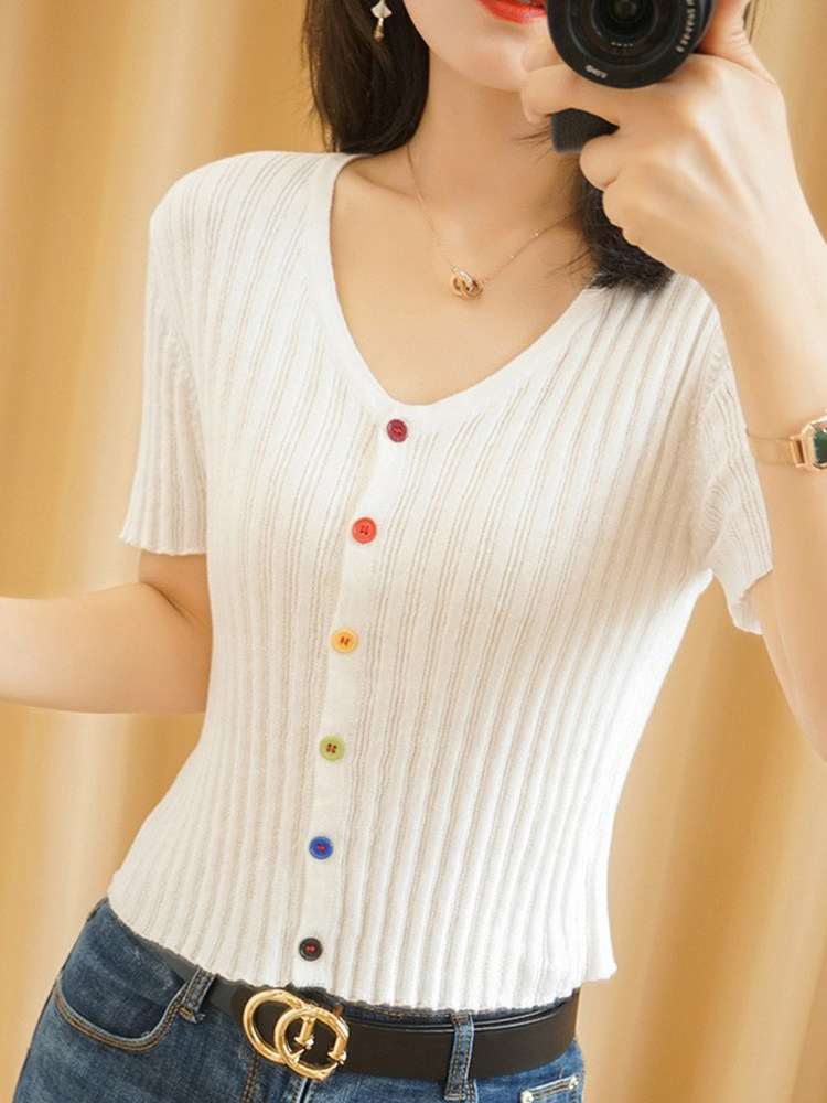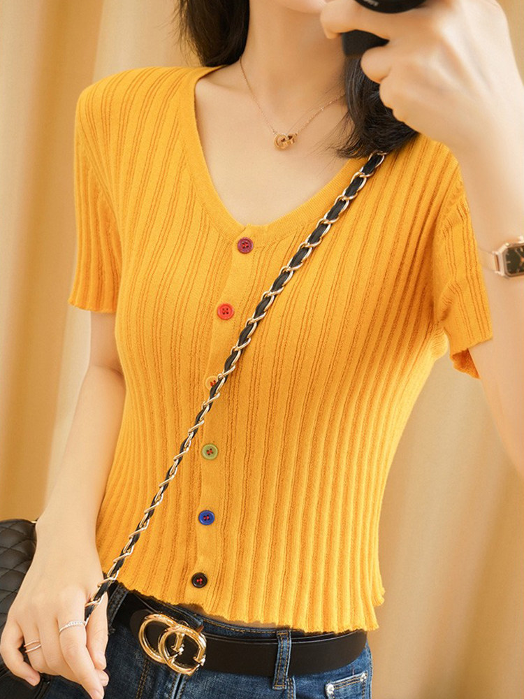 Summer new rainbow high waist crop top women's V-neck collarbone cotton knit sweater ins trendy short-sleeved T-shirt