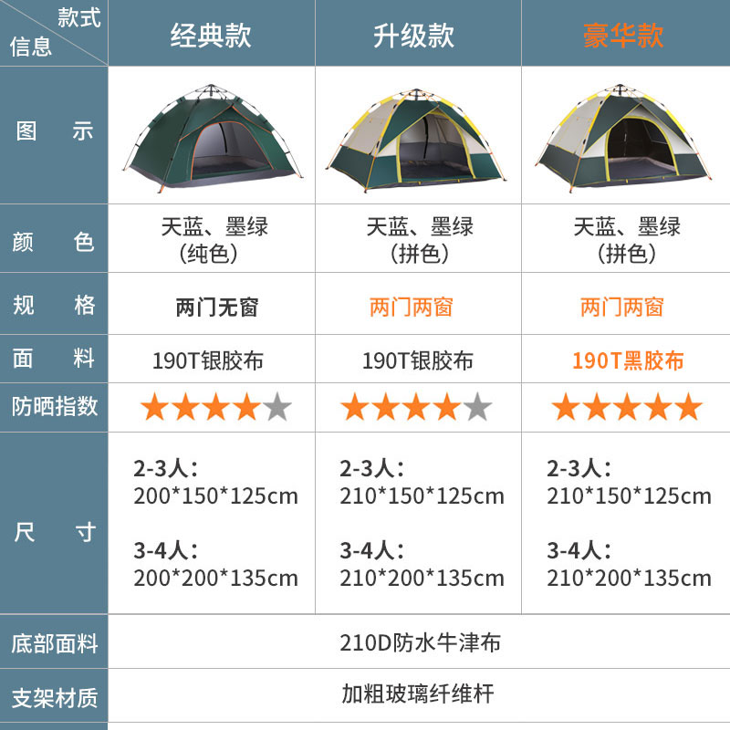 (One door, one window)2-3 people Dark green (one door, one window)2-3 people Dark green moisture-proof mat (two doors, 2-3 people)Sky blue (upgrade rain-proof eaves) (Two doors, 2-3 people)Dark green