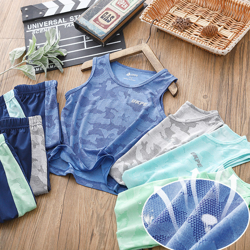 Boys quick-drying mesh suit 2021 summer new medium and large children's vest shorts two-piece set of children's sports sleeveless