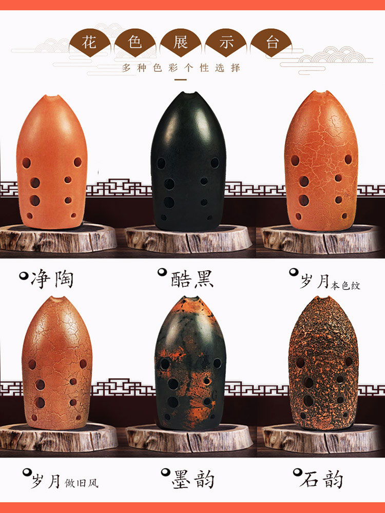 All ten holes are professionally played fine tuning Sound quality performance is the same just the appearance is different Pure pottery 10 hole F tone Net pottery 10 hole G tone Black pottery 10 hole F tone Black pottery 10 hole G tone Years - natural color pattern 10 hole F tone Years - Natural color pattern 10 holeS G tone Years - Old wind 10 hole F tone Years - Old wind 10 holeS G tone Ink rhyme 10 hole F tone Ink rhyme 10 hole G tone Stone rhyme 10 hole G tone Learning type small C tone