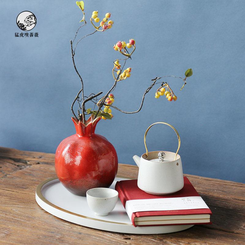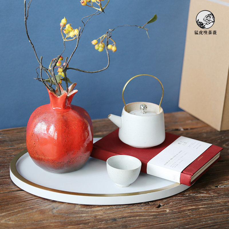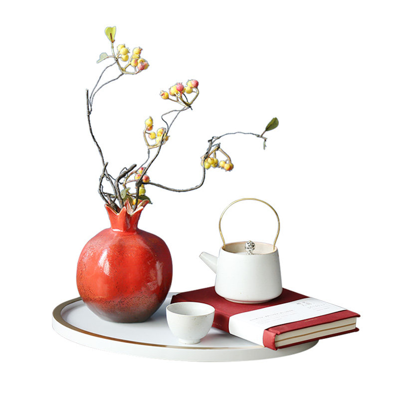 New Chinese-style red pomegranate vase simulation flower teapot white tray package model bedroom tea room decoration