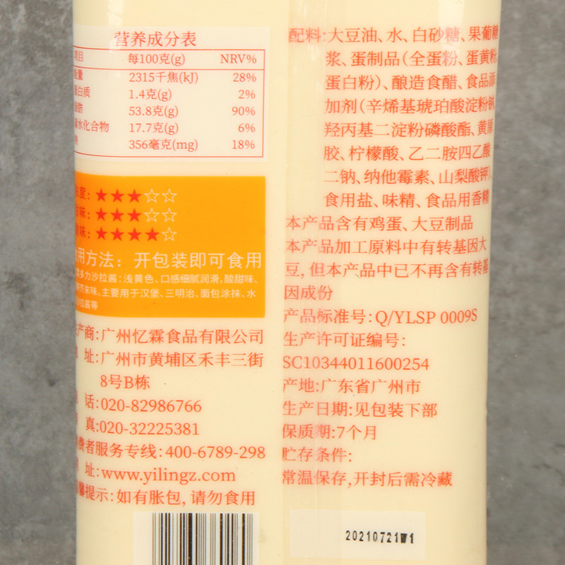 Soybean oil and water white granulated sugar fructose syrup egg products (whole egg powder egg yolk powder single white powder) brewing vinegar food additive (octenyl succinate starch sodium hydroxypropyl distarch phosphate xanthan gum citric acid B