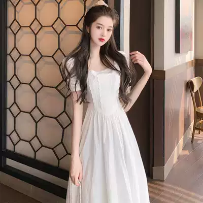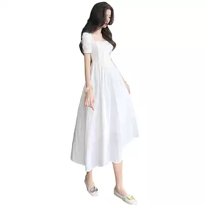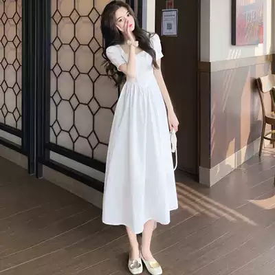 Sweet white dress female summer bubble sleeve long skirt thin and high temperament square collar skirt fairy super fairy forest department