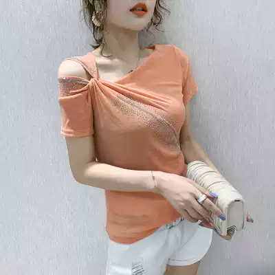 2021 summer dress new sexy strapless T-shirt women's short sleeve hot diamond top half sleeve collar small shirt net yarn T-shirt tide tide