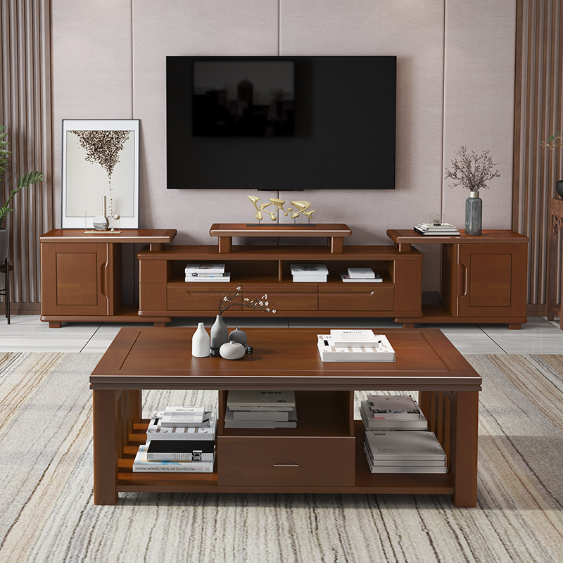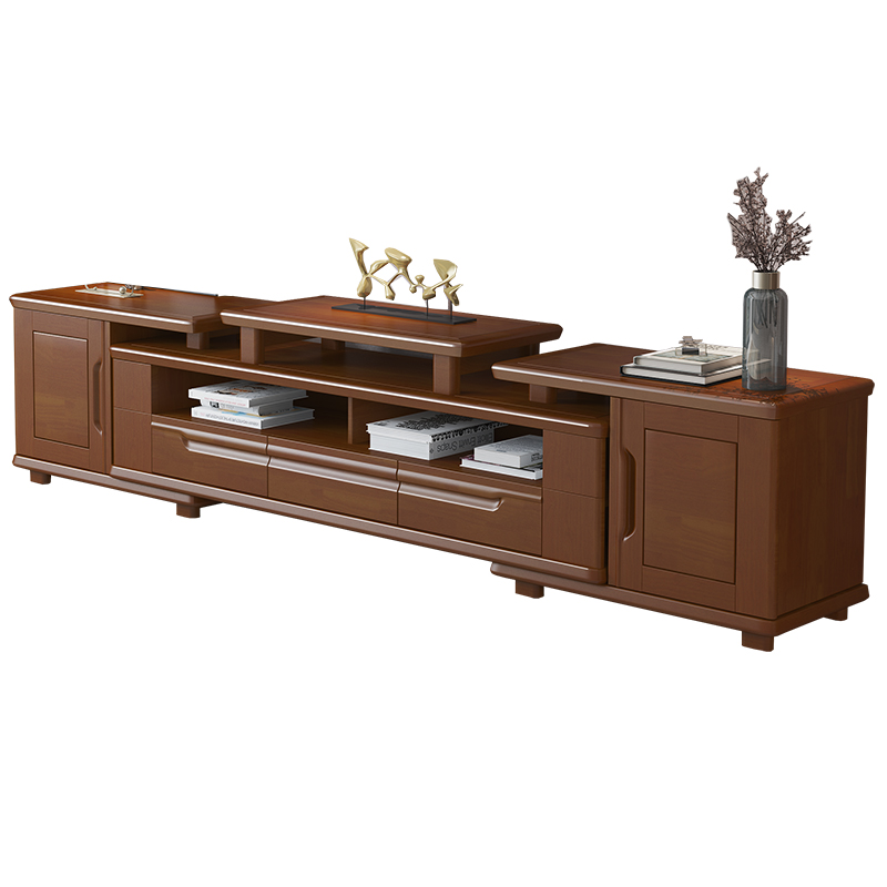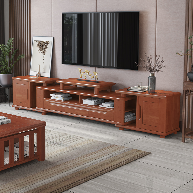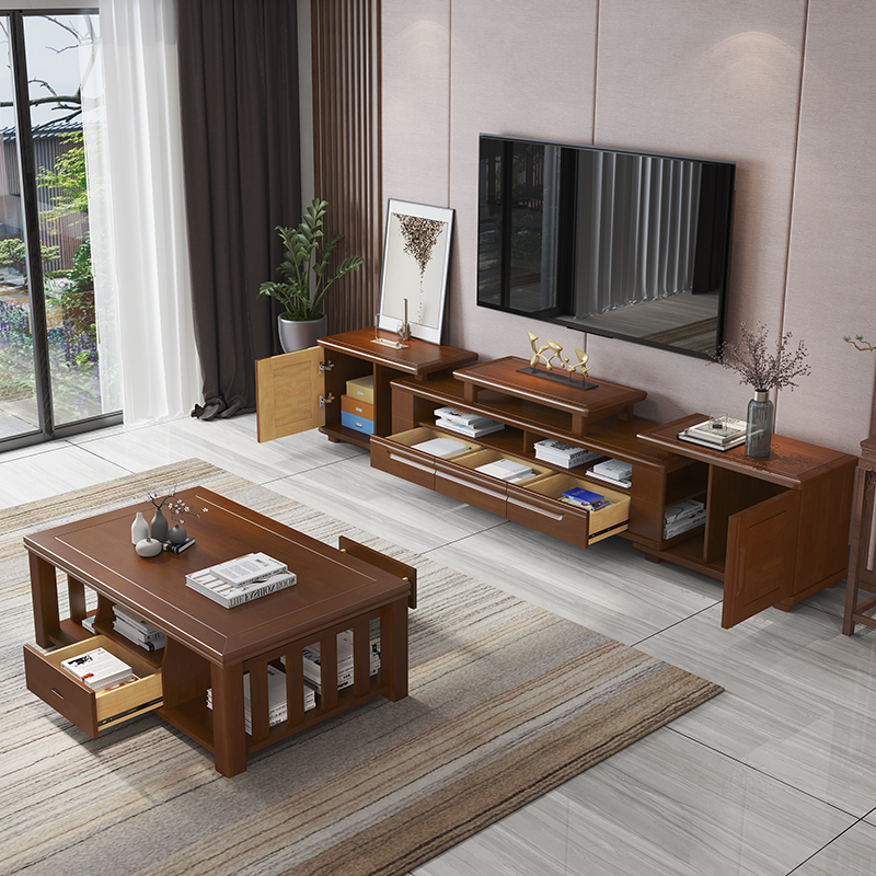 Chinese solid wood TV cabinet telescopic walnut color floor cabinet coffee table combination storage cabinet living room furniture