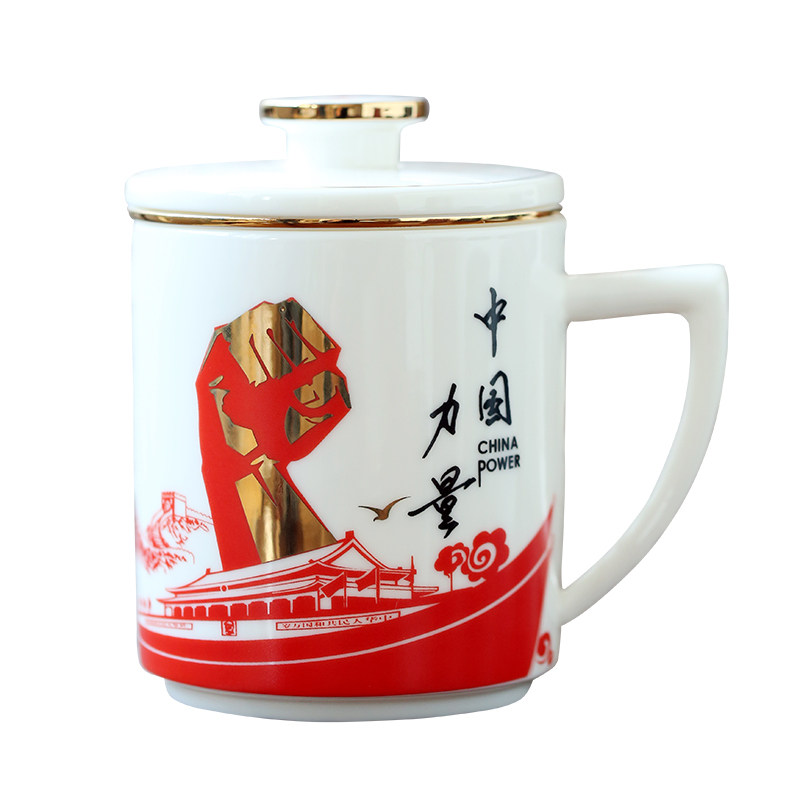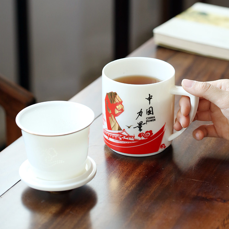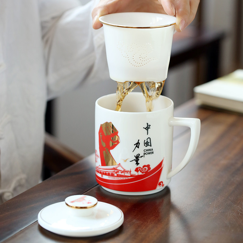 Goat Fat Jade Porcelain High-end Filter Office Bubble Tea Cup Belt to customize the meeting boss President's Cup water glass ceramic gift custom-Taobao