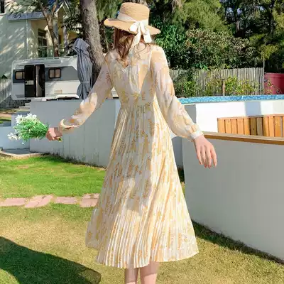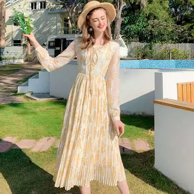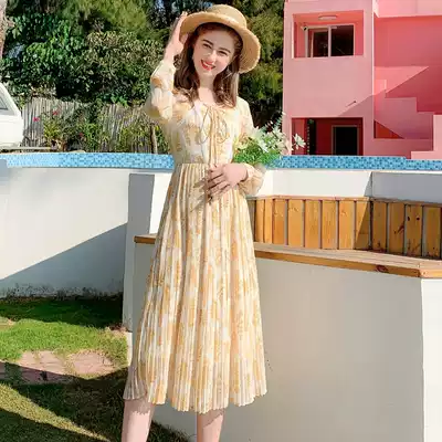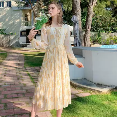 French thin square collar floral chiffon dress 2020 new early spring yellow pleated skirt children's summer long skirt