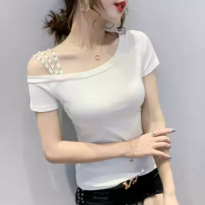 Single-shoulder top female summer slanted shoulder temperament sexy strapless heart machine short sleeve T-shirt nail drill half sleeve small shirt slim T-shirt