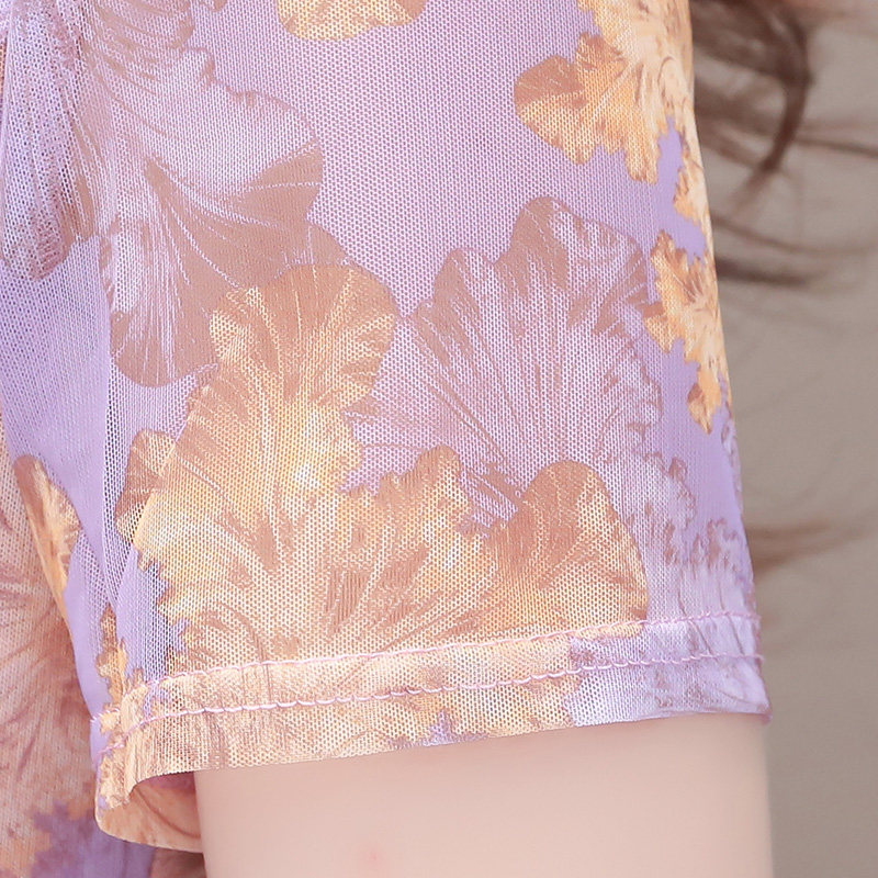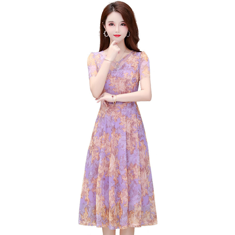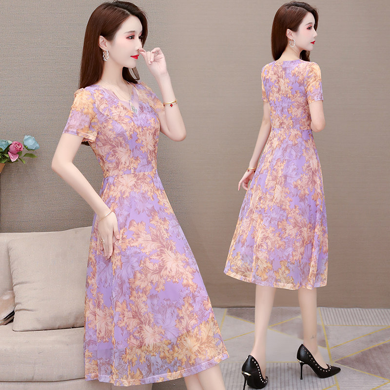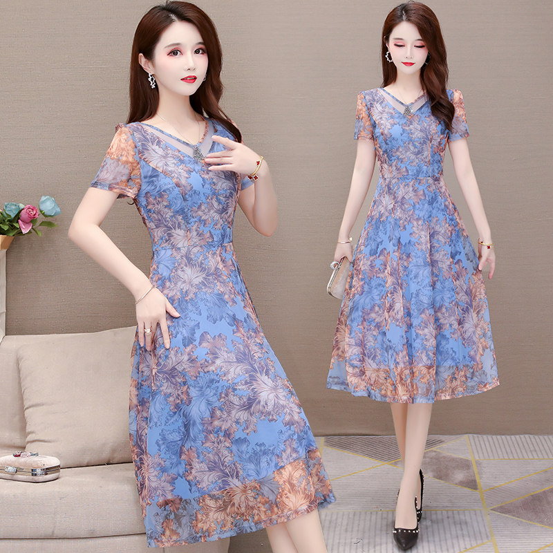 Dress women's summer 2022 new self-cultivation and thin fashion age-reducing V-neck mid-length over-the-knee printed skirt tide