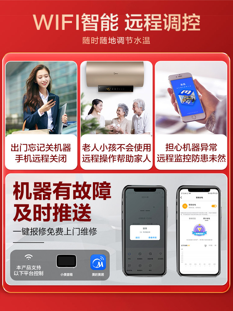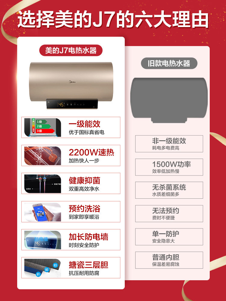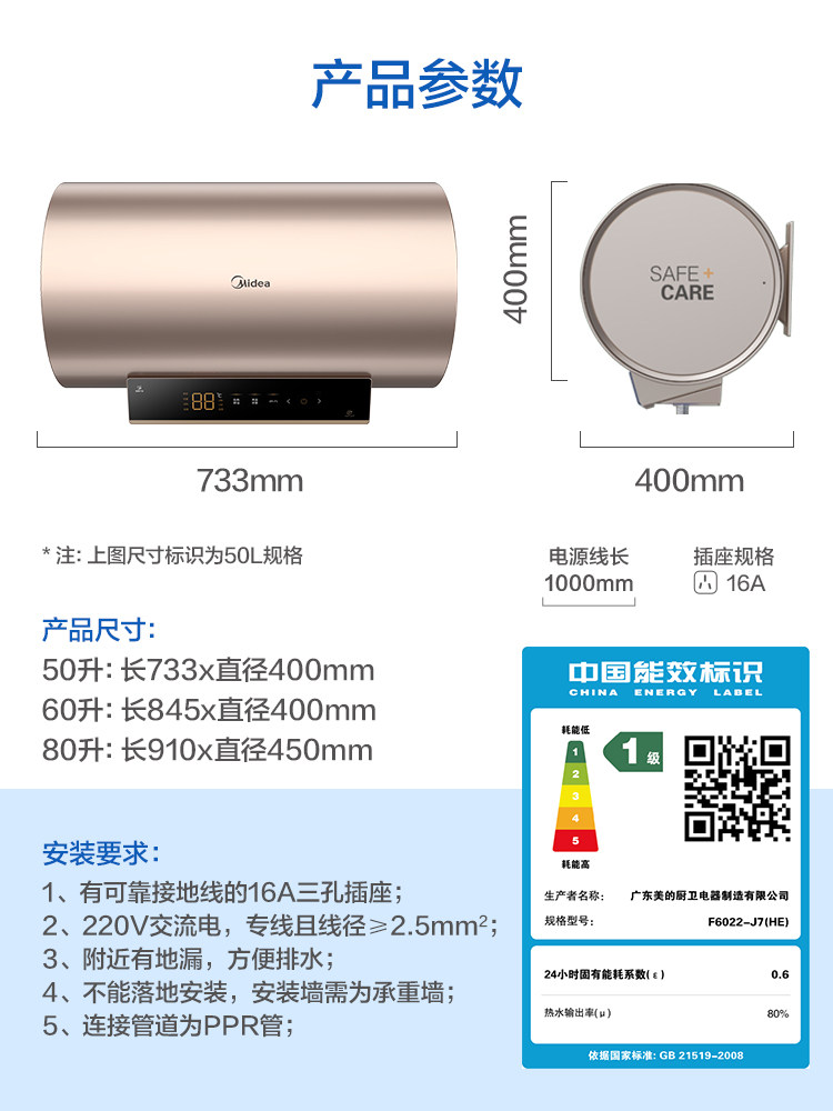 Midea 50 60 liter electric water heater home water storage type quick heat toilet bath 80L first class energy efficiency intelligent J7