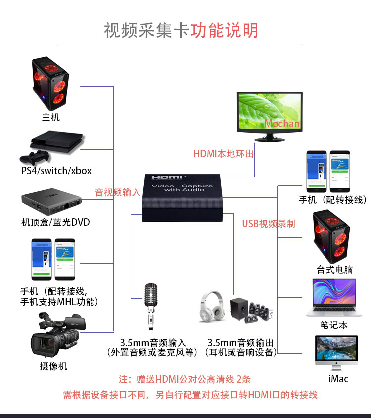 Video capture card with audio input usb HD hdmi set-top box computer switch PS4 game conference