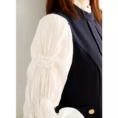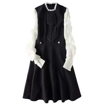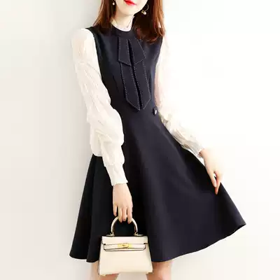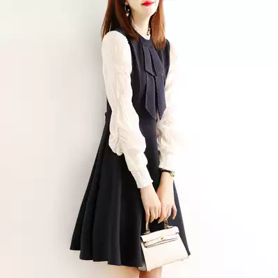 French goddess fan splicing fake two-piece long-sleeved dress women's spring 2020 new waist age reduction A-line skirt