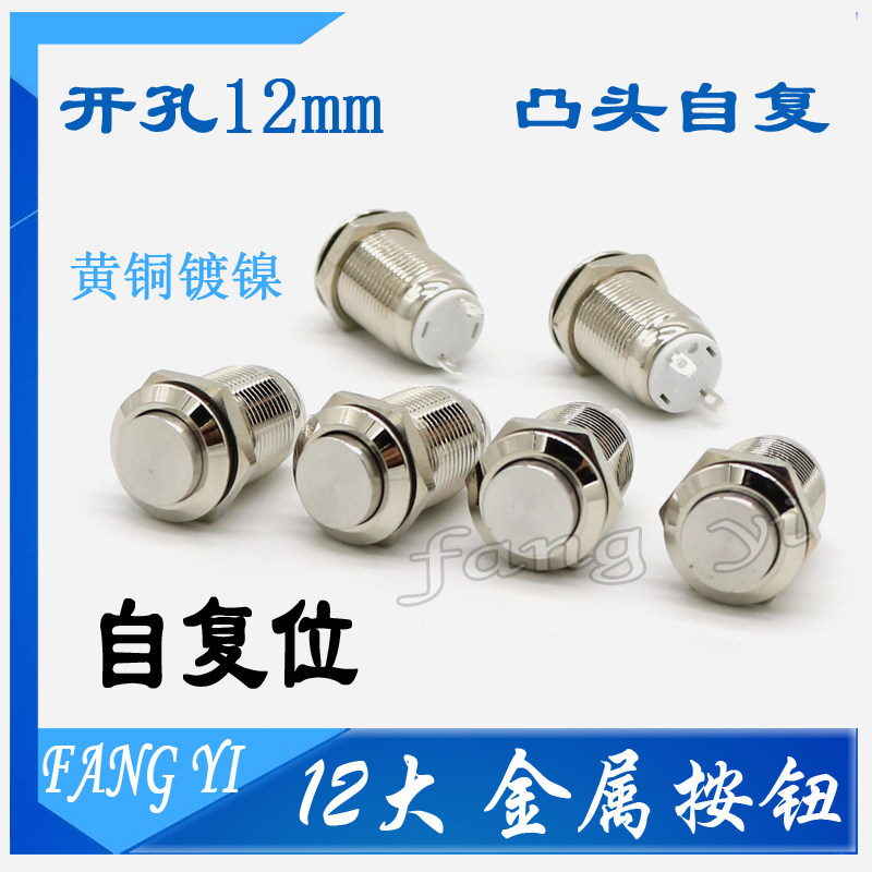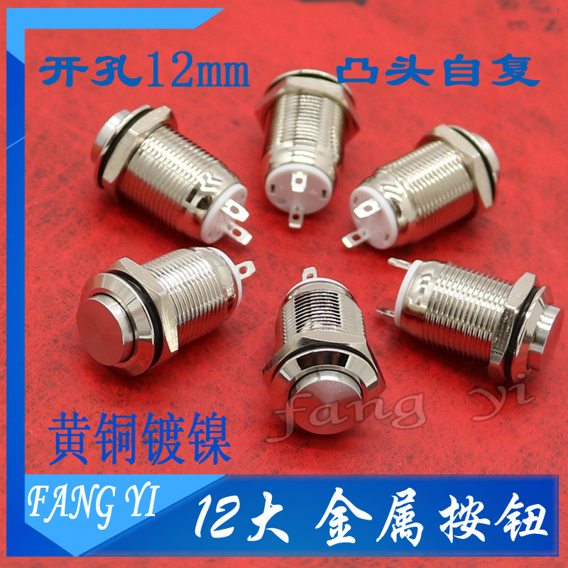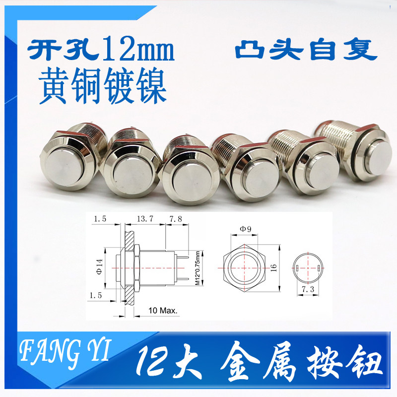 Metal button 12mm drilled self-reset jog button no light 2 feet protruding head copper nickel-plated no self-locking