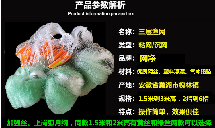 Reinforced silk green silk plastic floating 1 5 meters 2 meters 3 meters high 2 fingers 6 fingers three layers of weighted sinking net fishing net sticky net