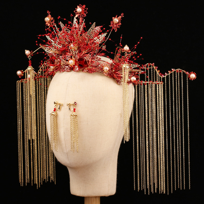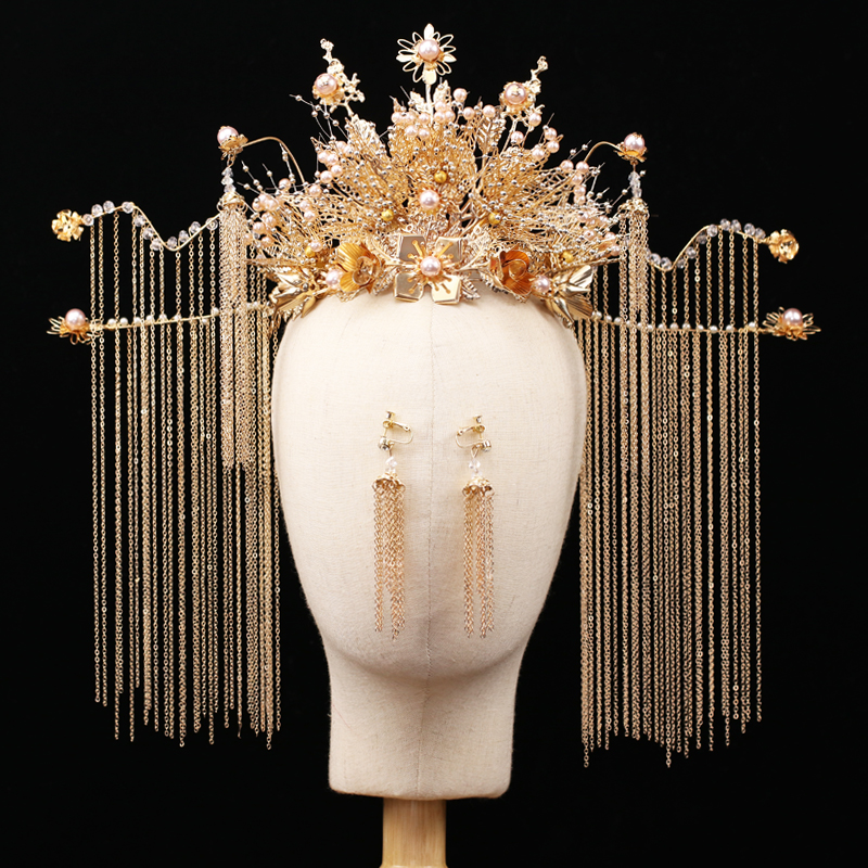 New bride headdress Chinese luxury fengcheng court ancient wedding Xiuhe clothing suitable round face