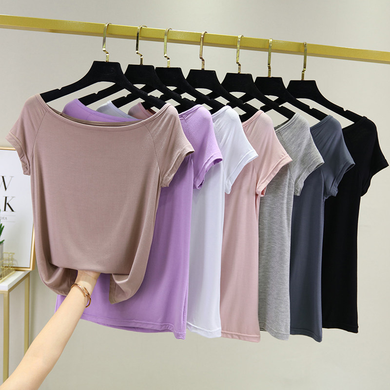 Modal one-word shoulder short-sleeved T-shirt women's summer low-collar base shirt Thin one-word collar sexy slim-fit off-the-shoulder top