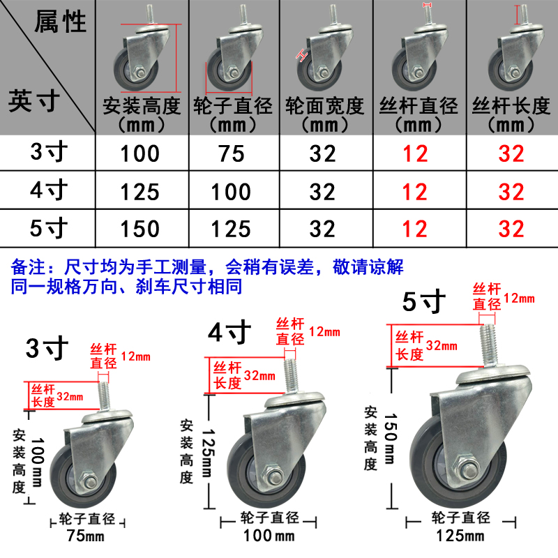 3-inch screw wheel 3-inch screw brake wheel 4-inch screw wheel 4-inch screw brake wheel 5-inch screw 5-inch screw brake wheel 3-inch wire rod (2-wire 2-wire brake) 4-inch (2-screen brake)