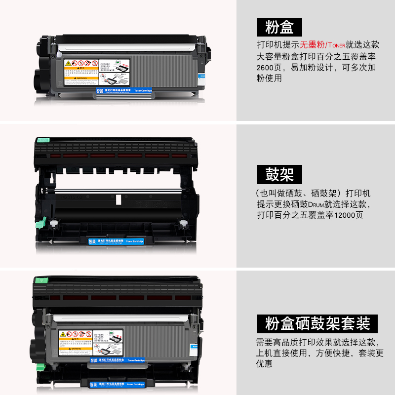 Toner Cartridge Toner Cartridge = Ready to Use (Buy 5 Get 1 Free) Toner Cartridge (Contain Powder) (Buy 5 Get 1 Free) Toner Cartridge Rack (Drum Rack) (Drum Rack is Powder Free) Automatic Reset Large-capacity Toner Cartridge Toner Cartridge