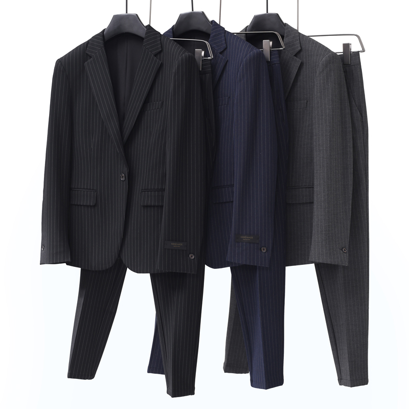 Light luxury spring and autumn quality striped suit men two pieces of trend mens small suit blue business dress