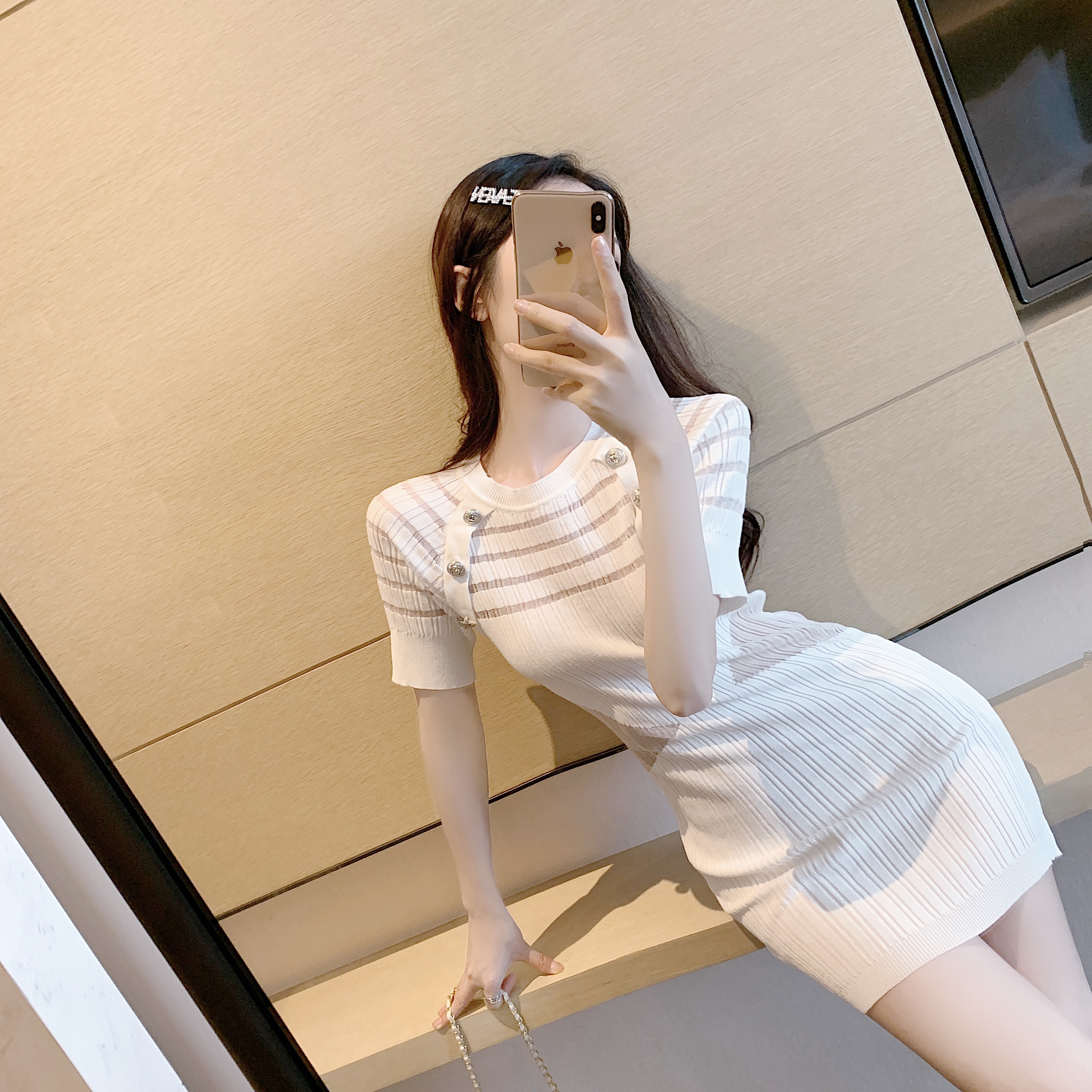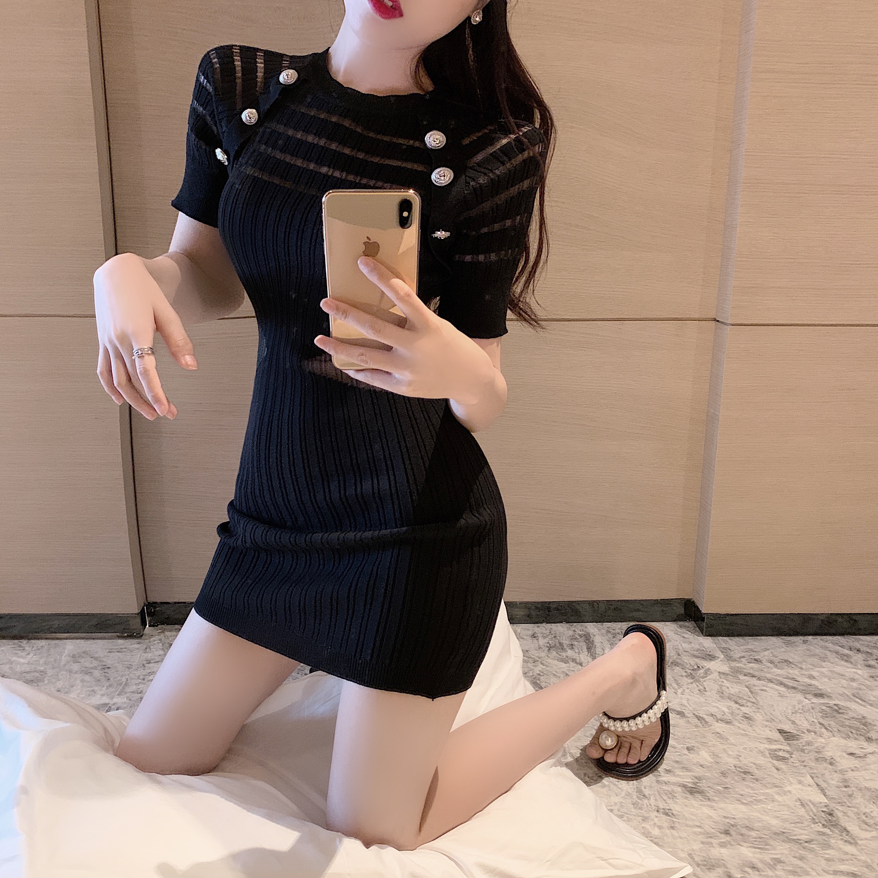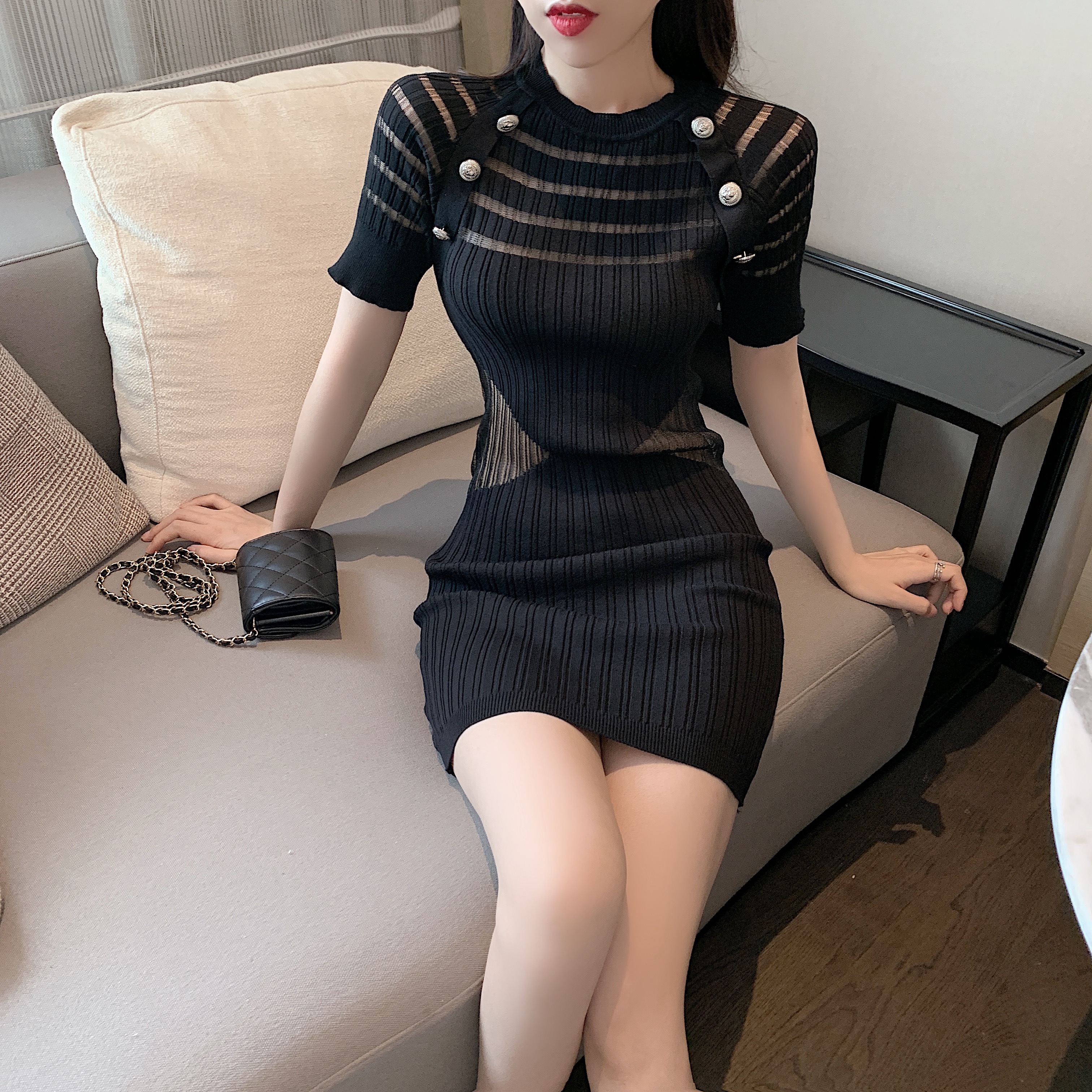 Summer New Hollowed-out Sexy Knit Foreign Dress Woman Fashion Slim Fit Slim Wrap Hip Skirt Temperament Small Black Dress