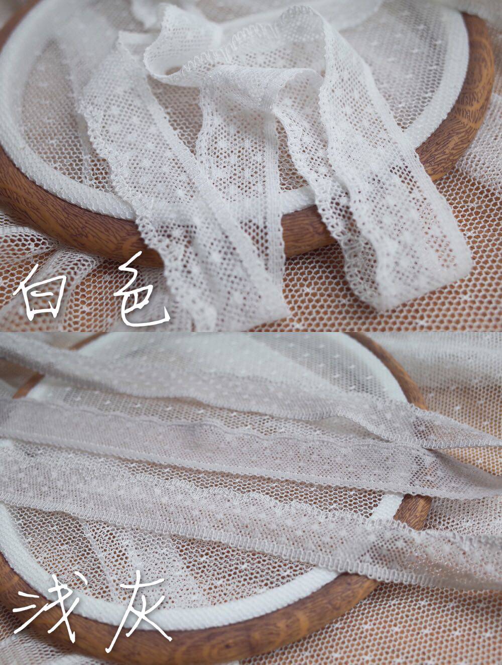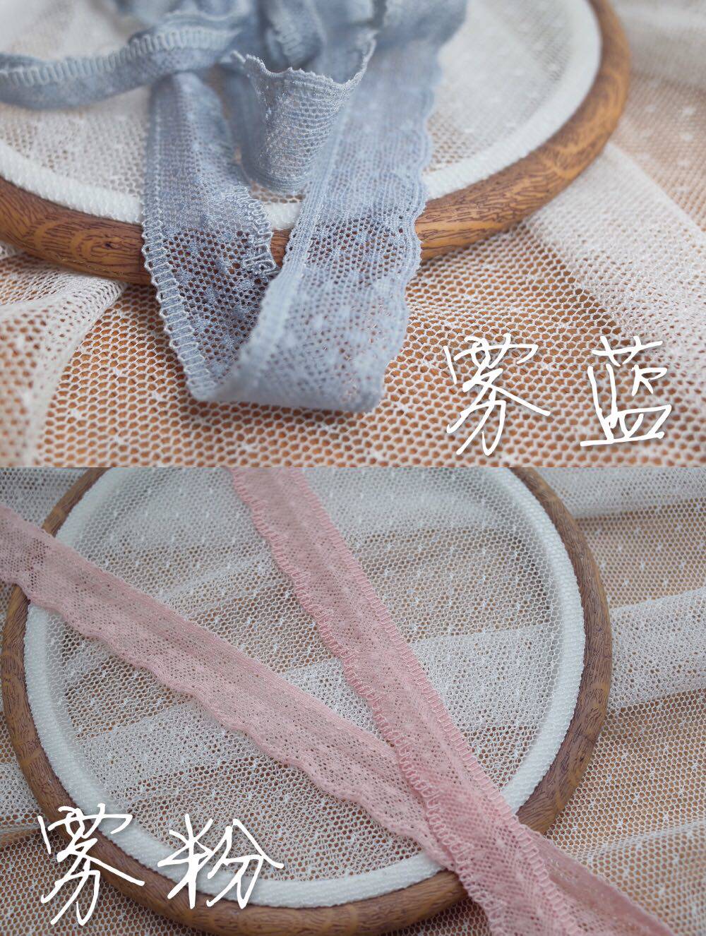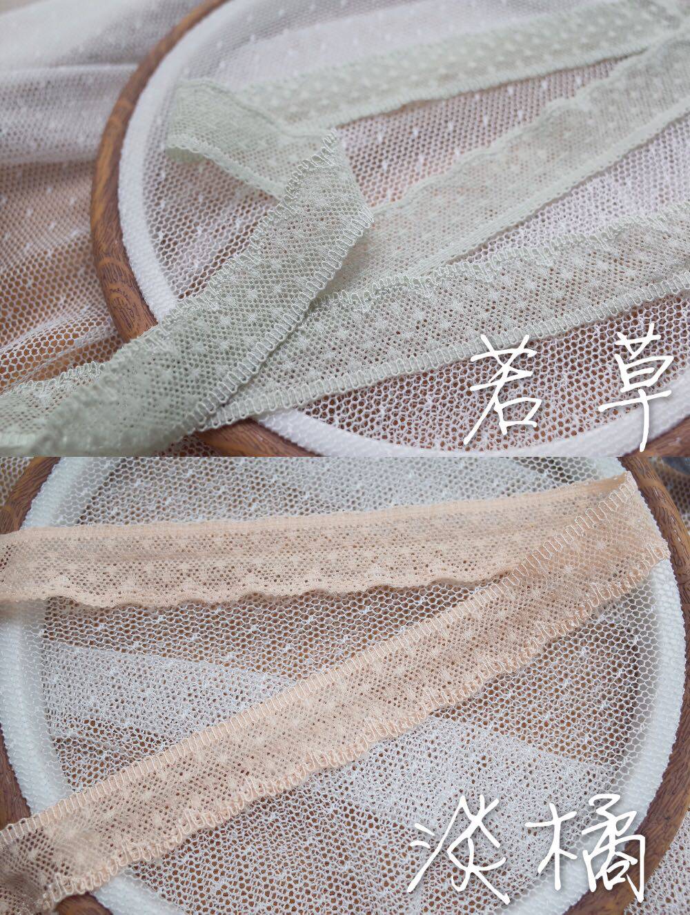 A piece of white dotted lace 1 meter black dotted lace a piece of 1 meter fog powder dotted lace a piece of 1 meter fog blue dotted lace a piece of 1 meter grassy little lace a piece of 1 meter light orange dotted lace a piece of 1 meter