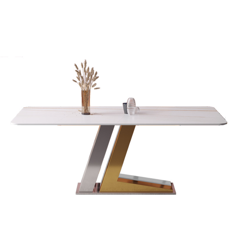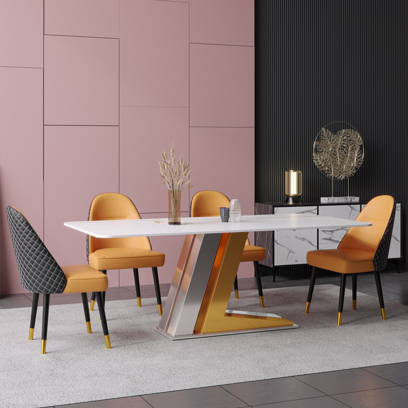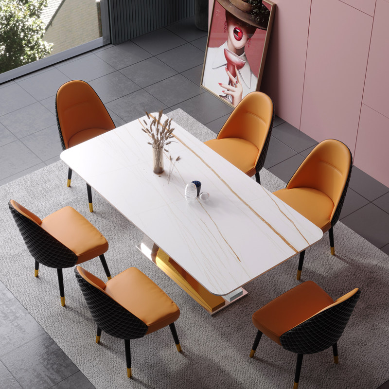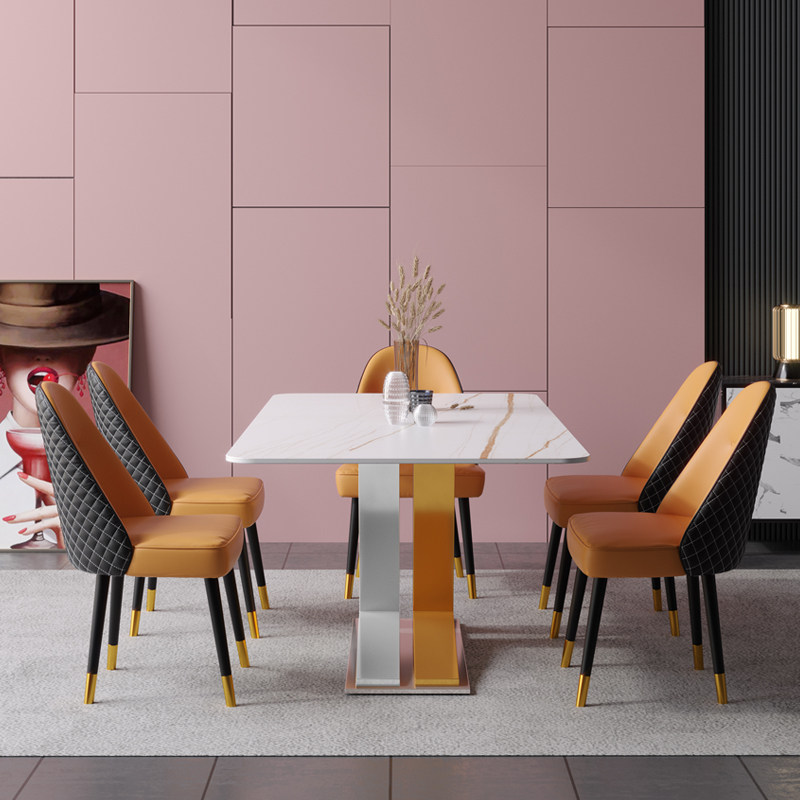 Nordic light extravagant titanium alloy and gold and silver dining table and chairs combined household small family type rock plate dining table designer personality-like board room