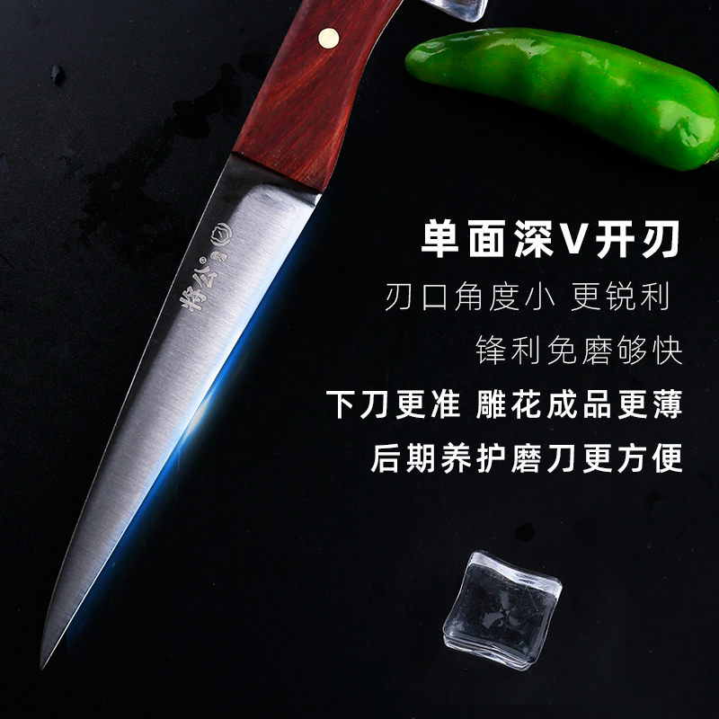 Take the public kitchen engraving main knife sharp and fast high-speed front steel single-sided deep V open edge chef Carved Knife knife sleeve