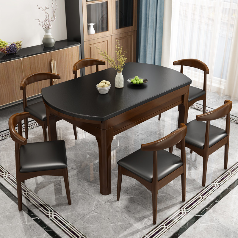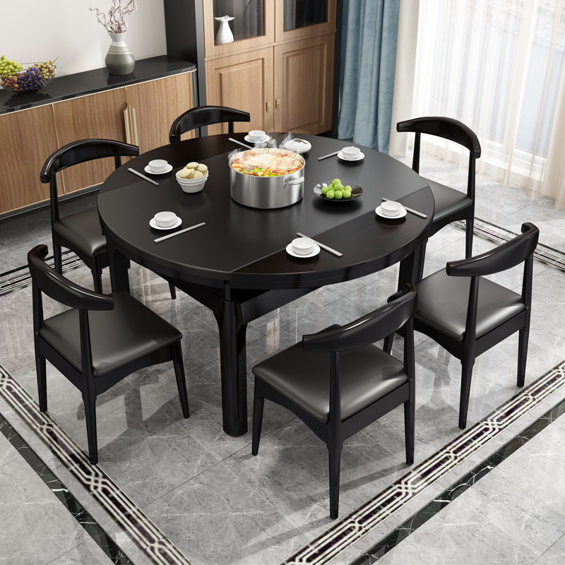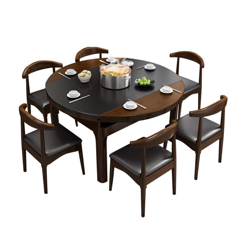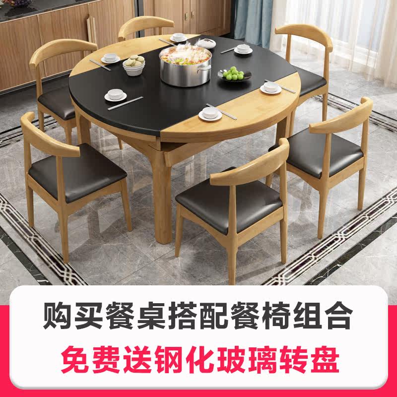 Fire stone dining table and chair combination Nordic light luxury round table Household retractable dining table with electromagnetic stove Full solid wood dining table