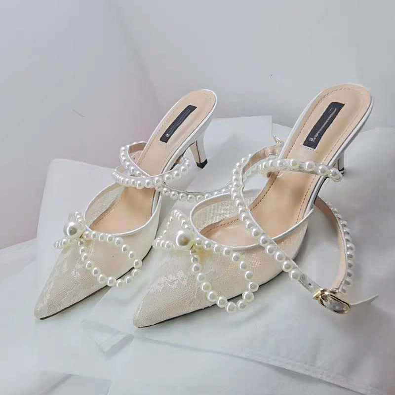 Tip-head half slippers female net veil butterfly-bow pearl-style character sandals high heels heels