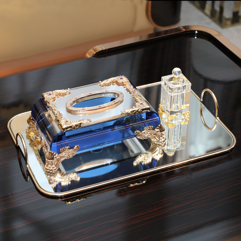 Toothpick holder + European gold tray + sapphire blue tissue box set of 3 pieces