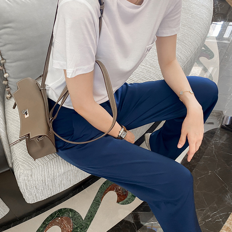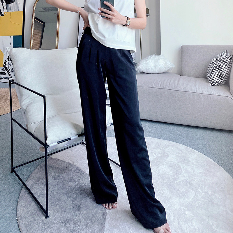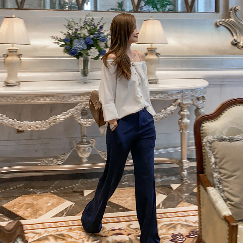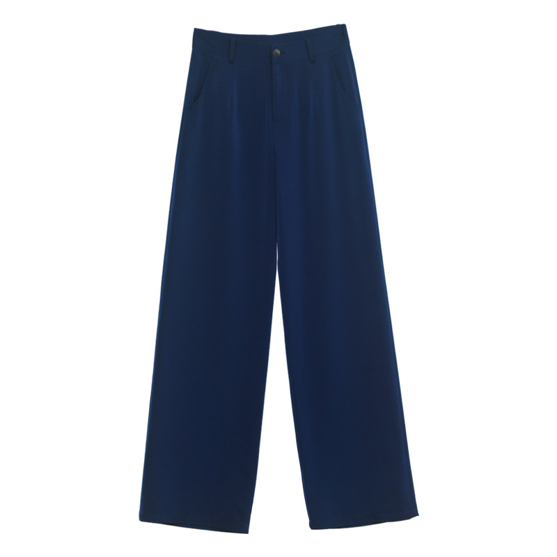 MEIYANG deep elite school imitation acetic acid NAVY blue high waist commuter suit straight wide leg trousers