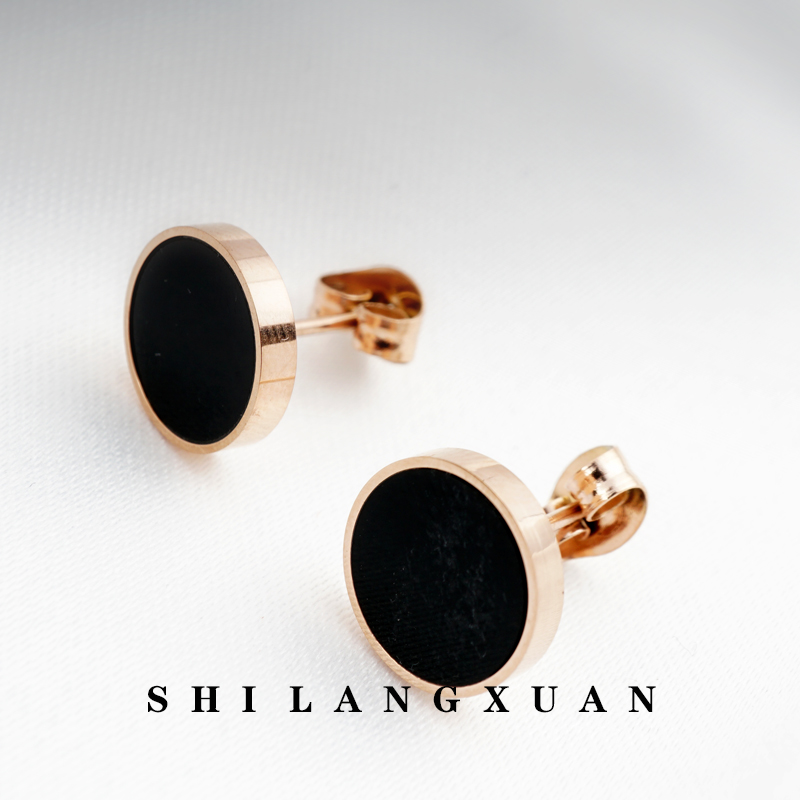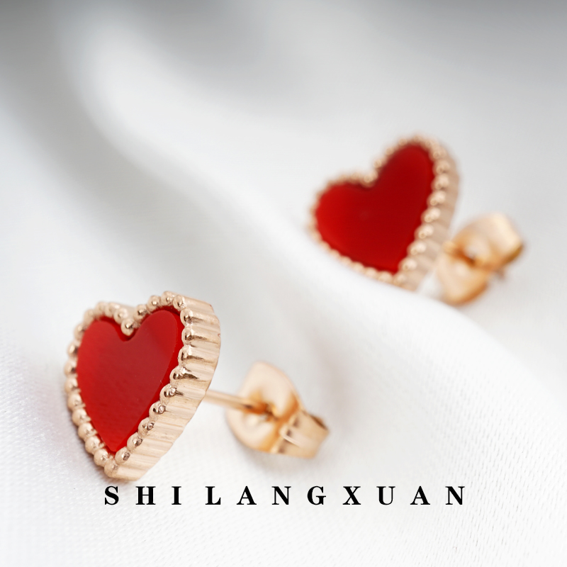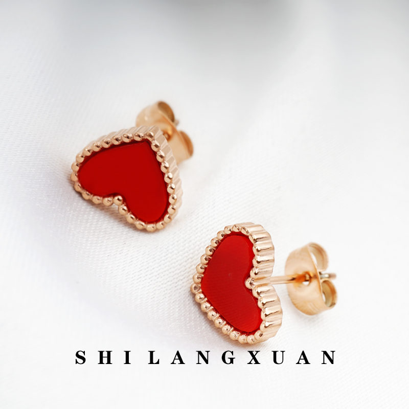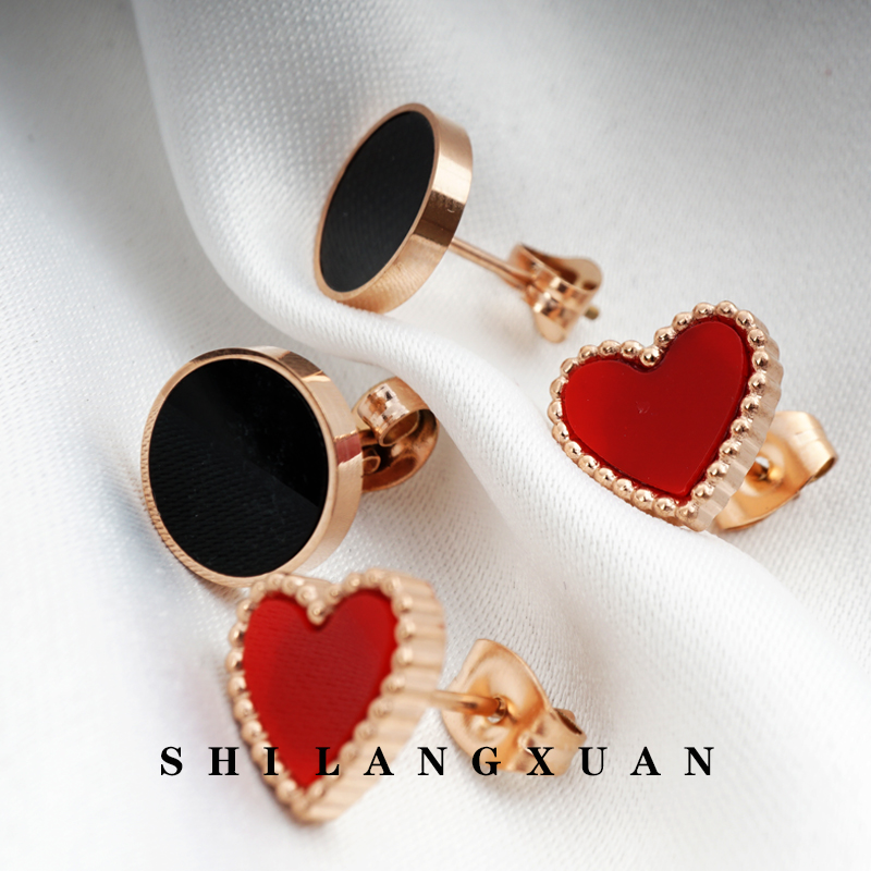 Drop Black Oil Round Small Short Hair Cute Peach Hearts Love Red Rose Gold Girl Ear Pin Titanium Steel Plated 18K Gold