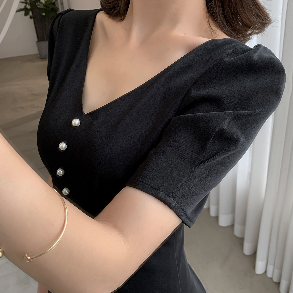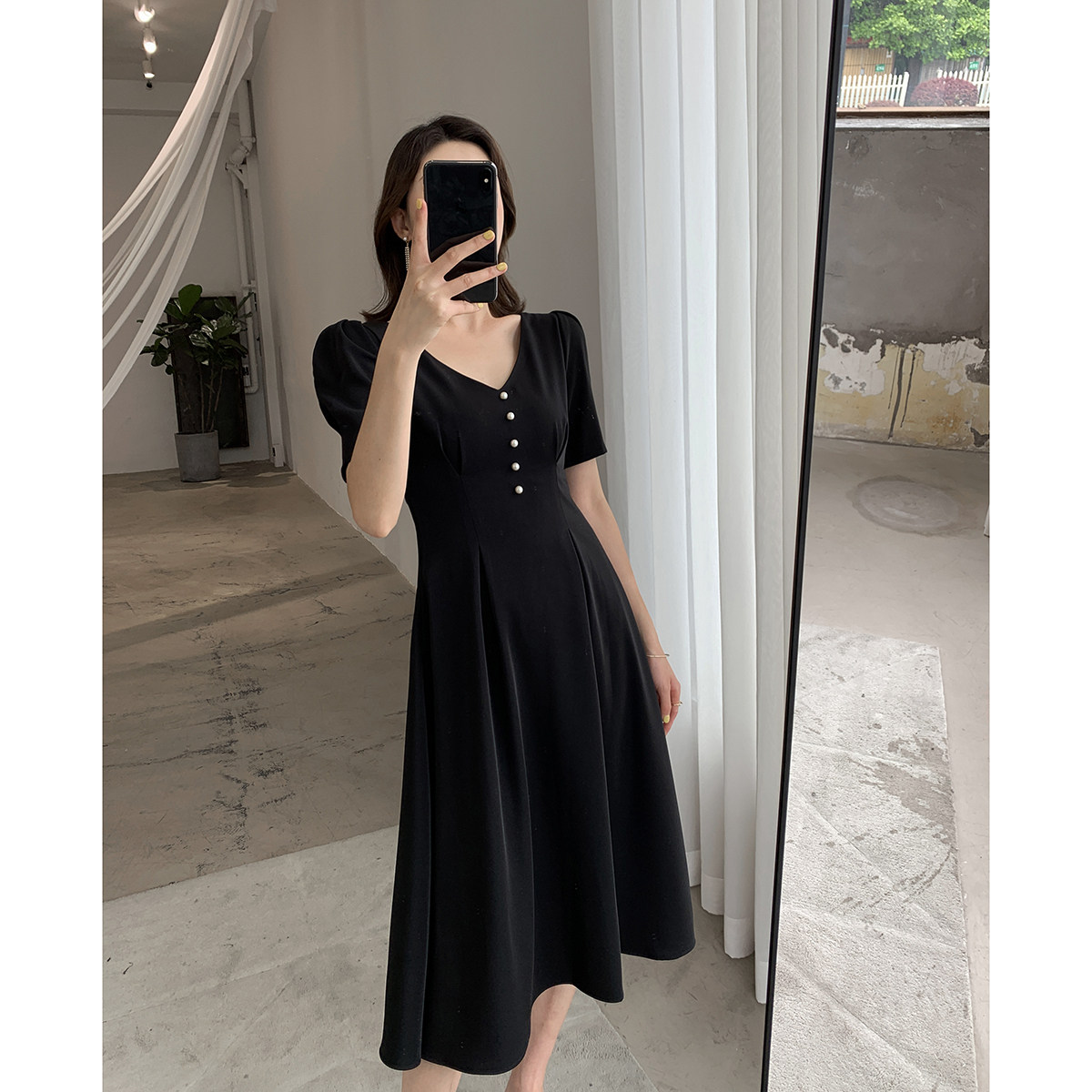 Guo Ge custom black dress women's 2022 new summer dress V-neck waist slim Hepburn style slim little black dress