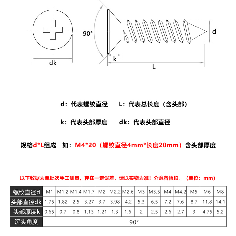 304 stainless steel flat head cross self-tapping countersunk head wood screw M4 2*10x12x14x16x38x50-75