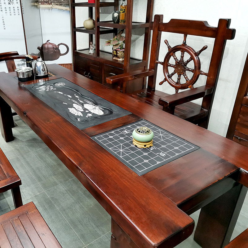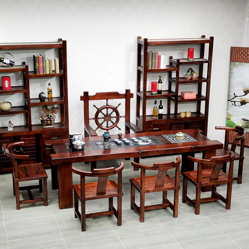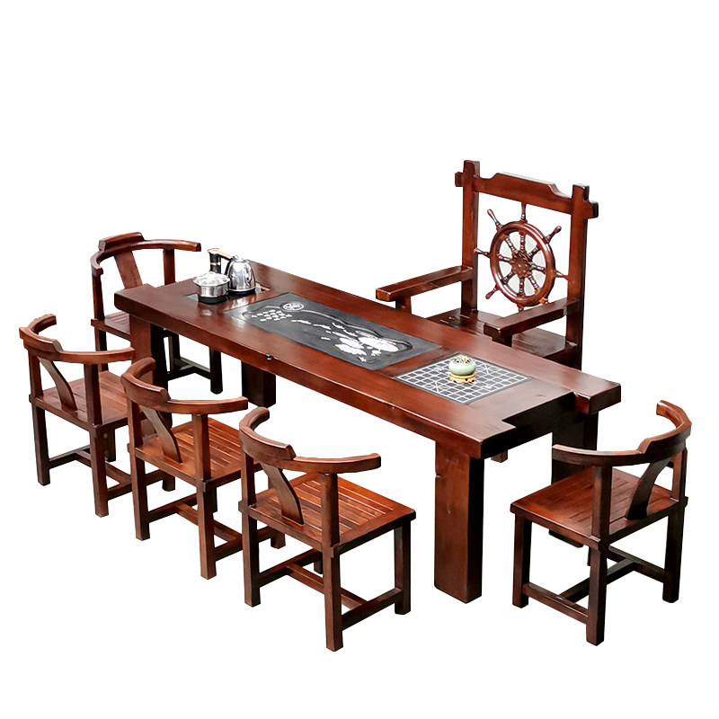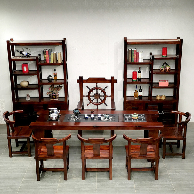 Old boat wood tea table and chairs combined solid wood balcony tea table tea table with boiling kettle integrated Chinese style Zen whole set of furniture
