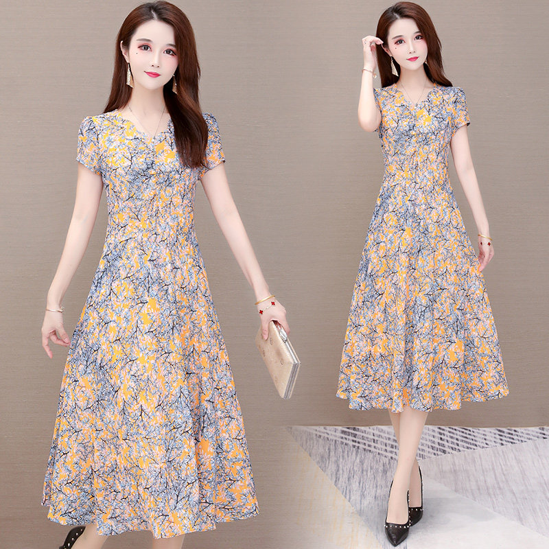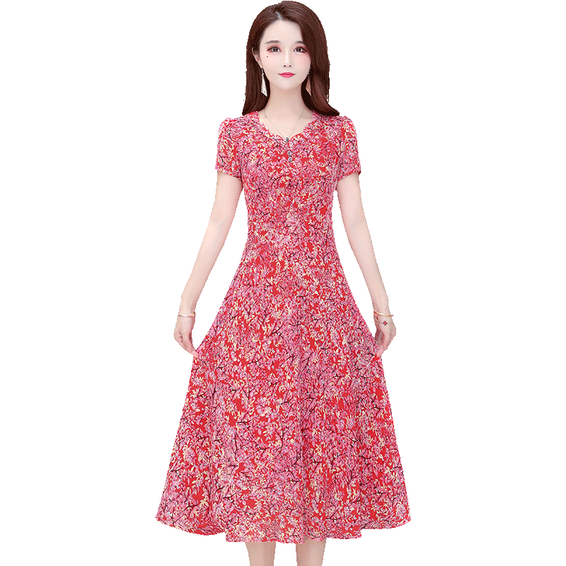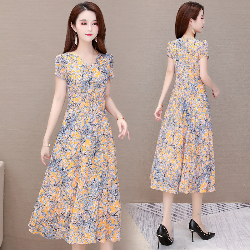 Short-sleeved dress women's summer 2022 new Korean style slim mid-length ladylike v-neck knee-length a-line skirt