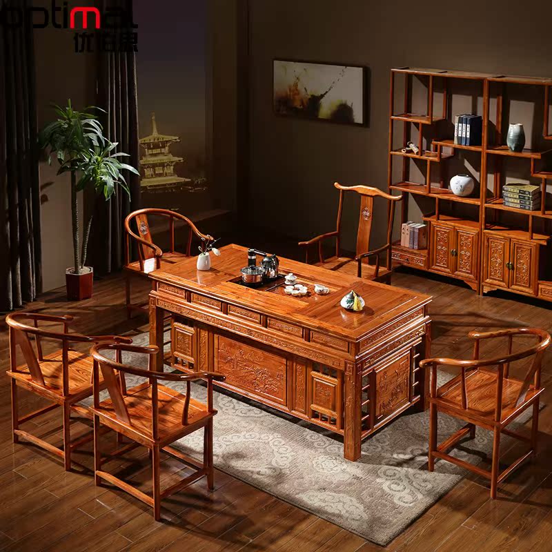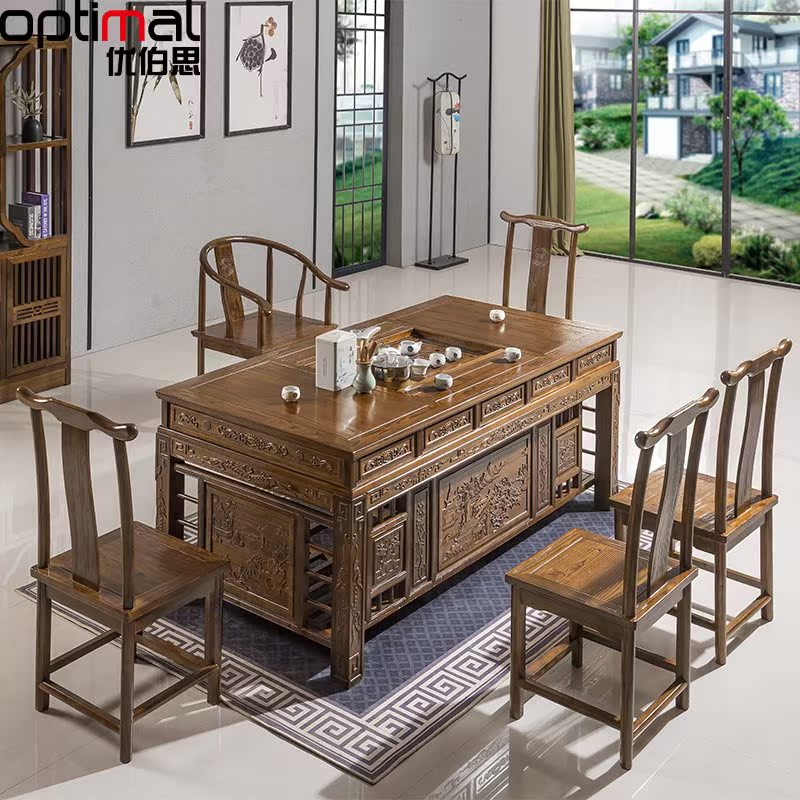 Nanchang 1 meter 8 tea table and chair combined Solid wood tea table set new Chinese elm office drink tea tables Zen