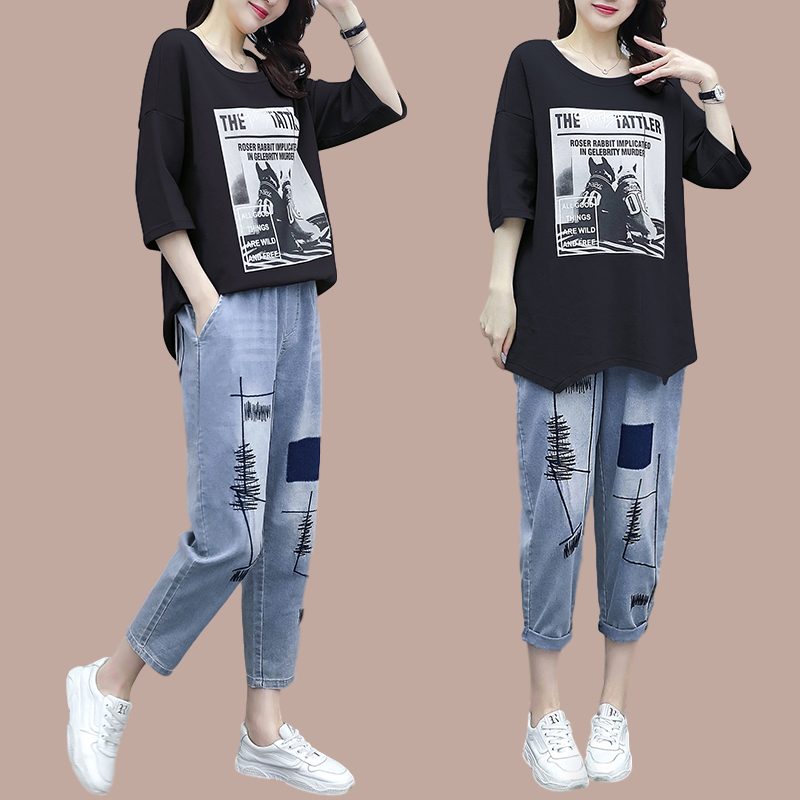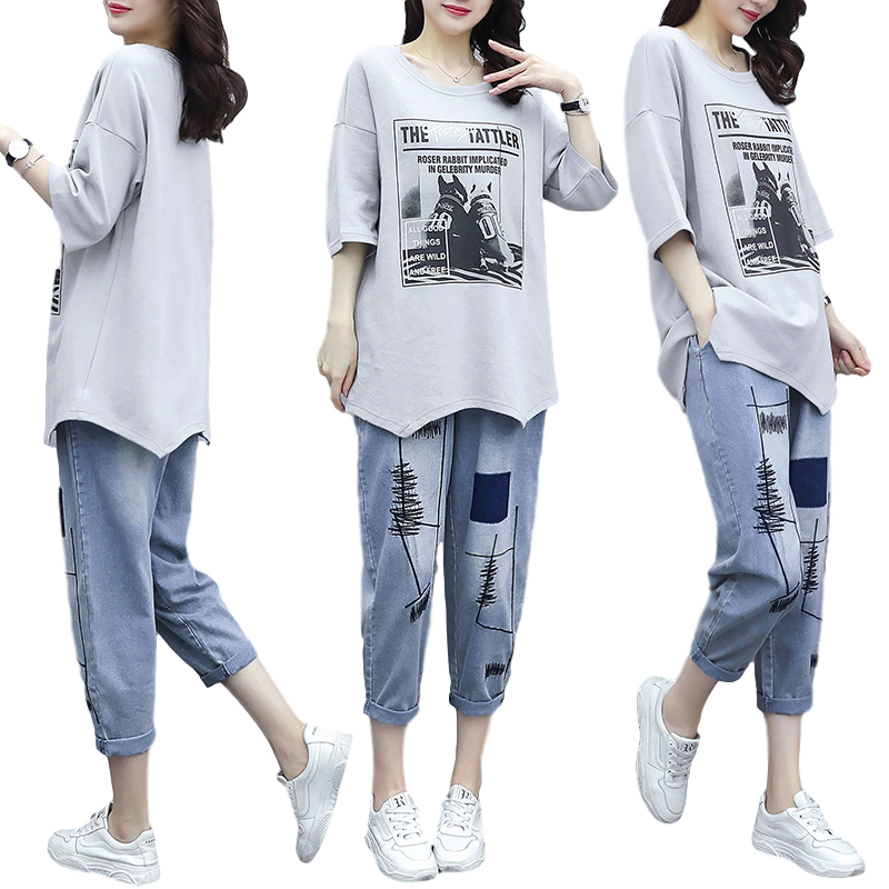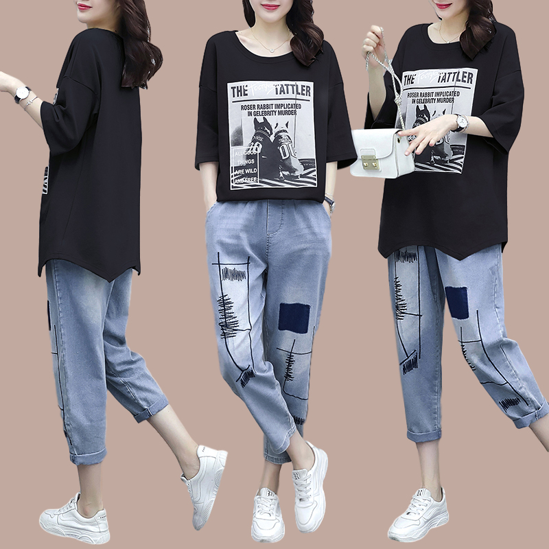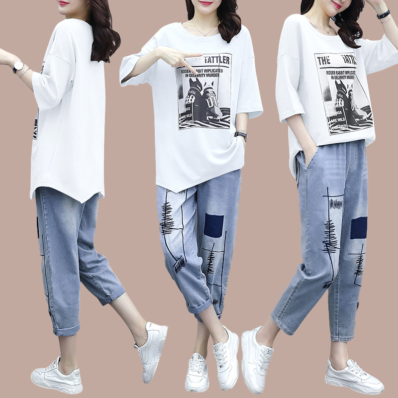 Casual Jeans Big T-Shirt Foreign Pie Two Sets 2022 Spring Summer New Korean Version Fashion Small Subsuit Female Tide