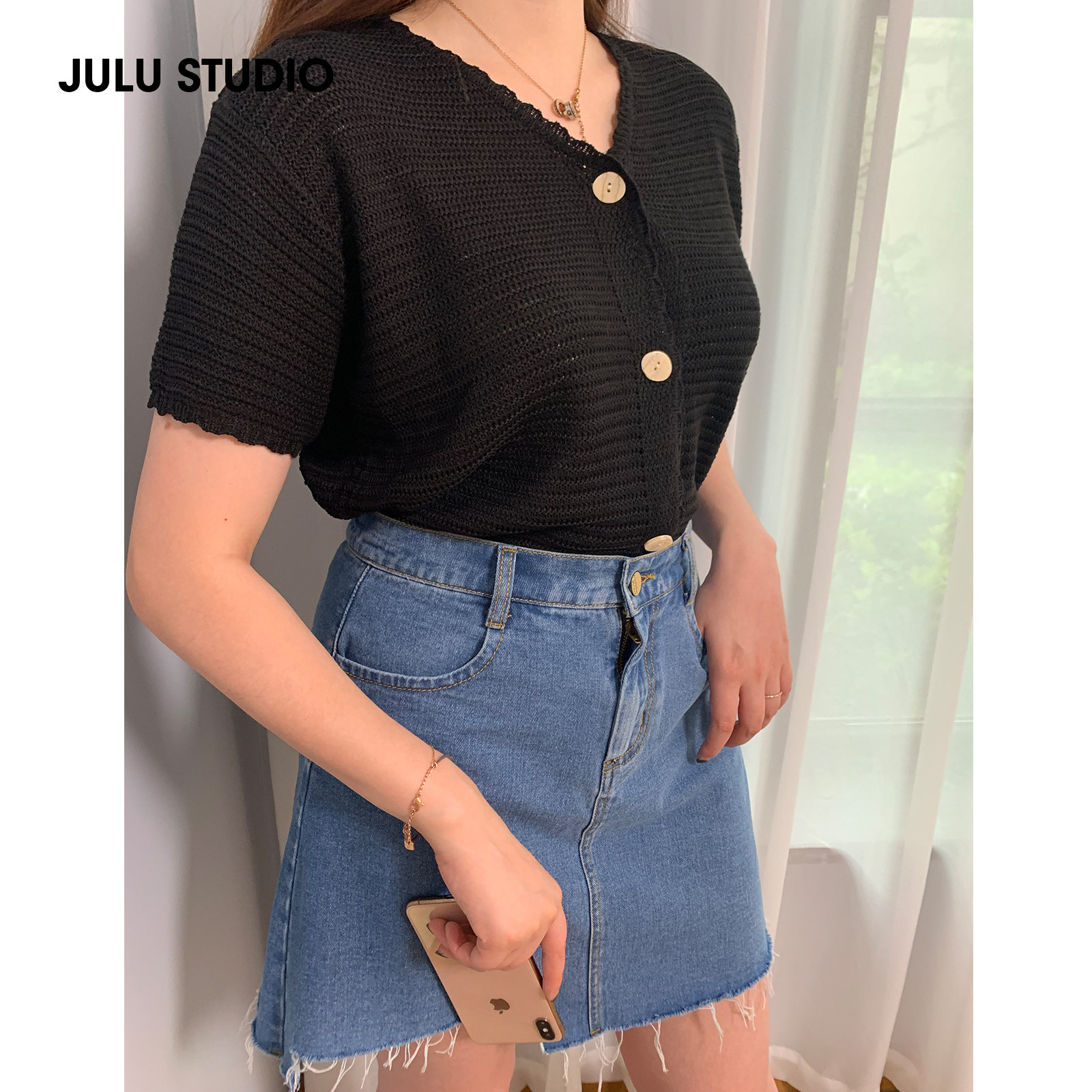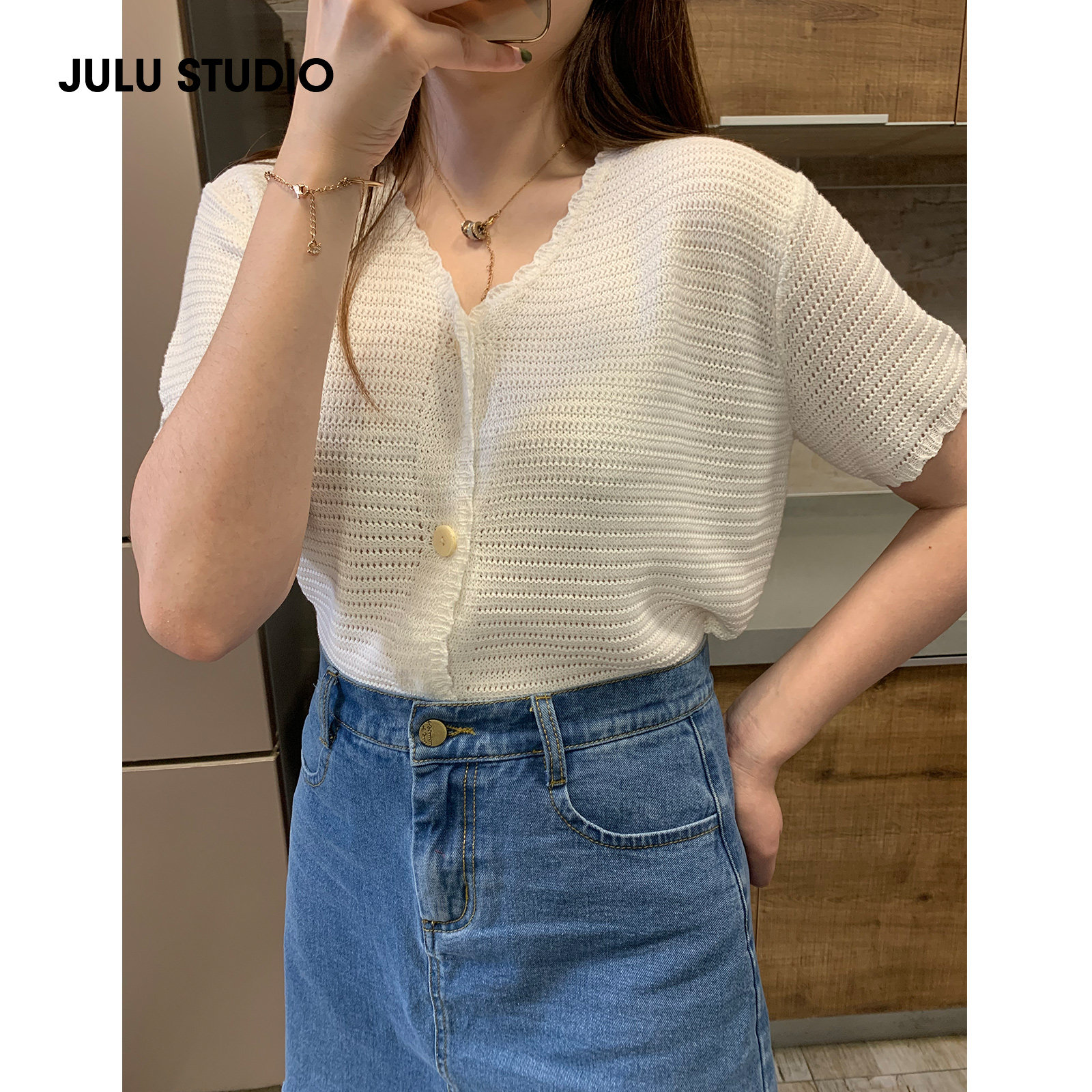 2021 summer French lace knitted sweater V-neck hollow cardigan thin section thin niche short-sleeved top