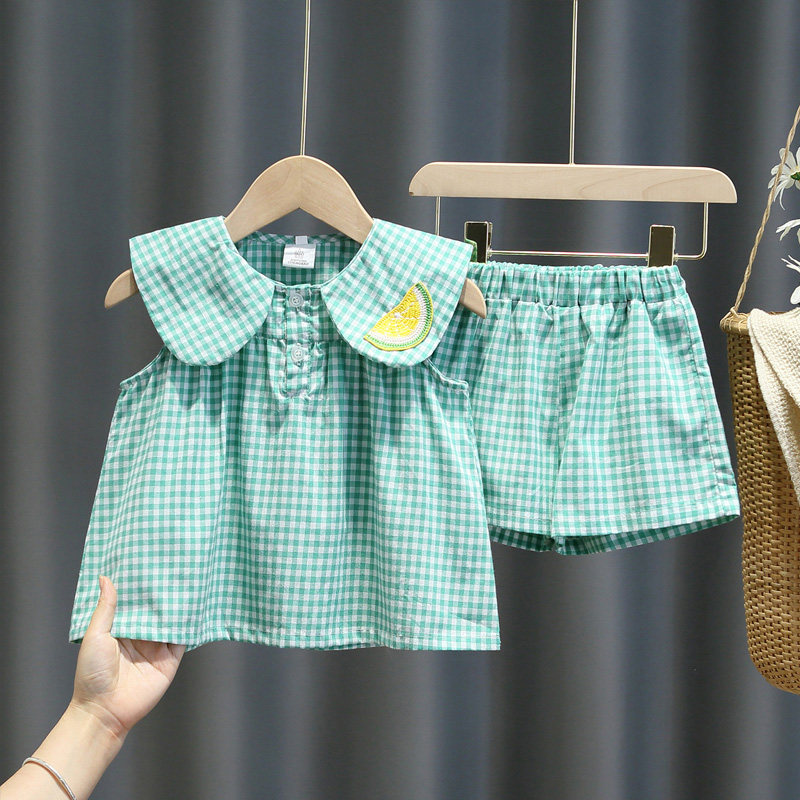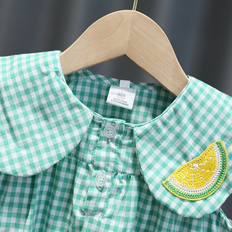 Female Baby Suit 2021 Summer Dress New Doll Collar Fruit Embroidered Plaid Women's Two-piece Style Suit