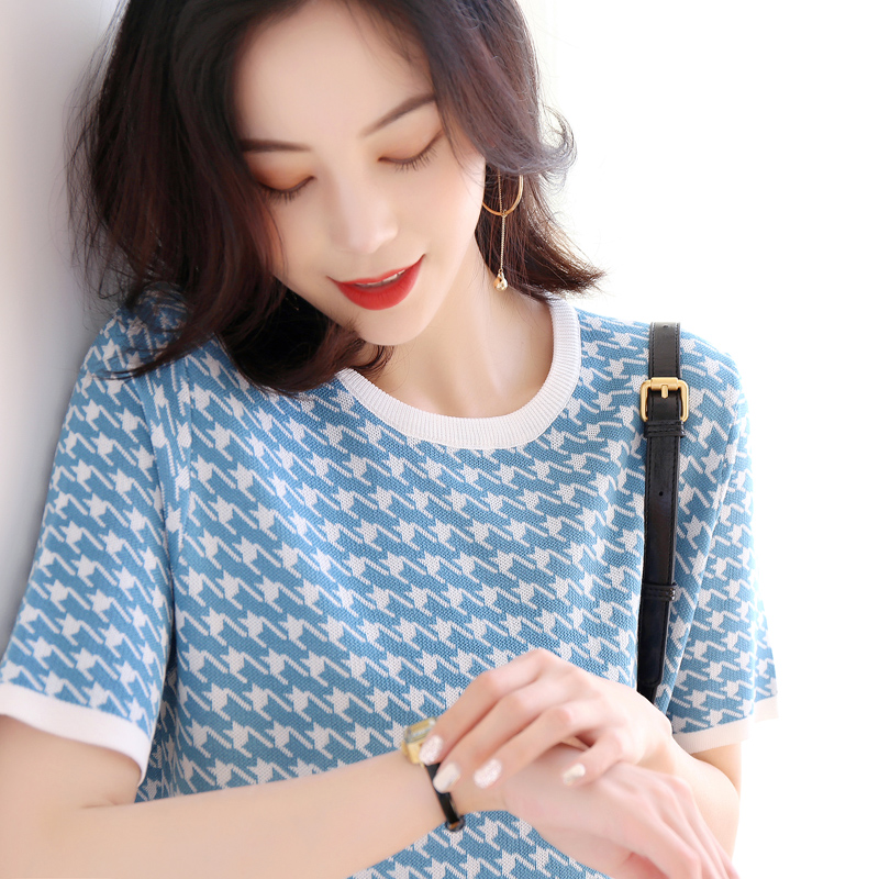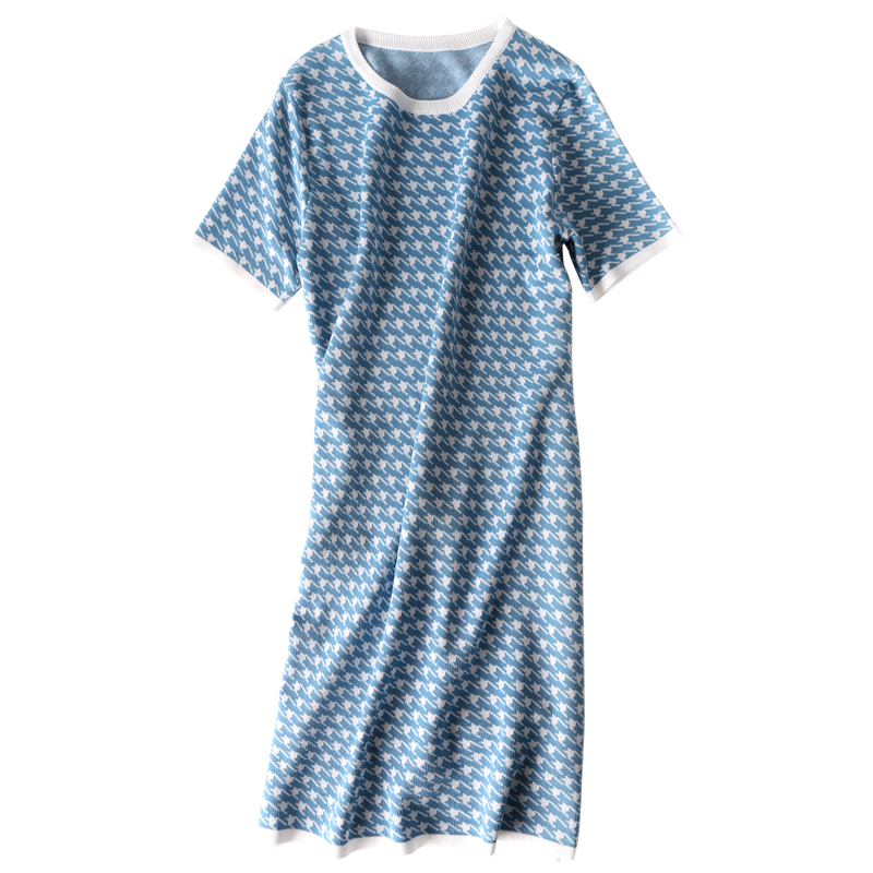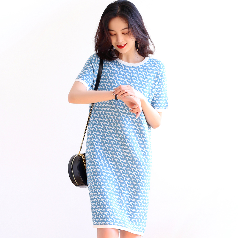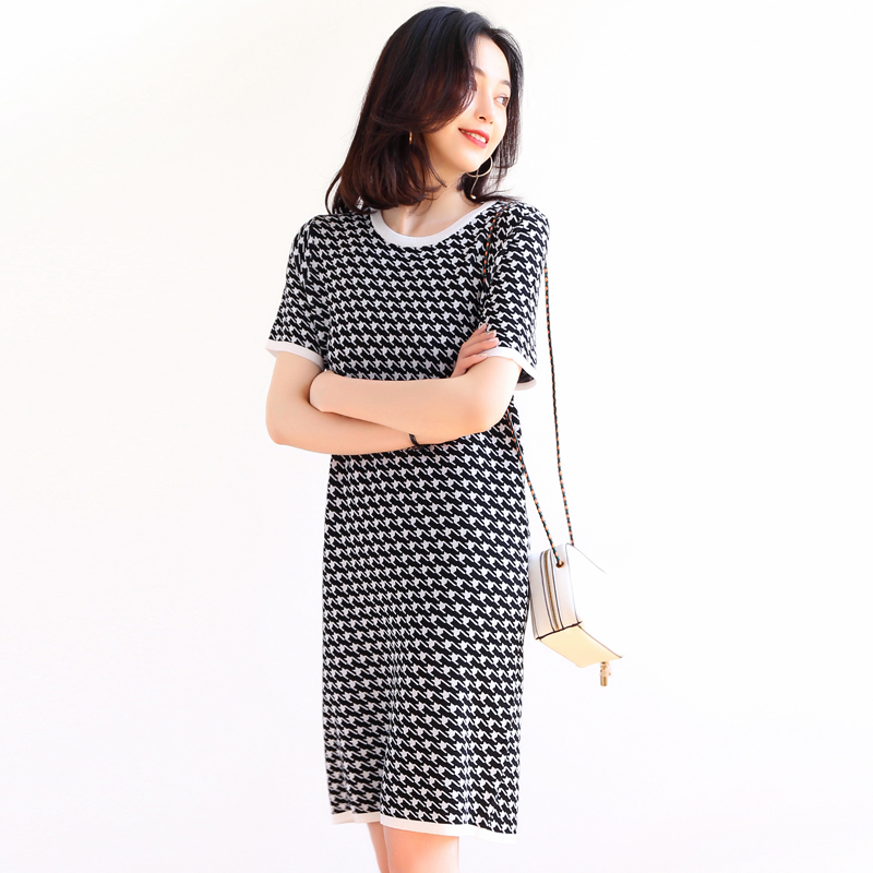 Malcenl klon loose ice linen knitted dress new summer women's Korean version houndstooth short-sleeved skirt