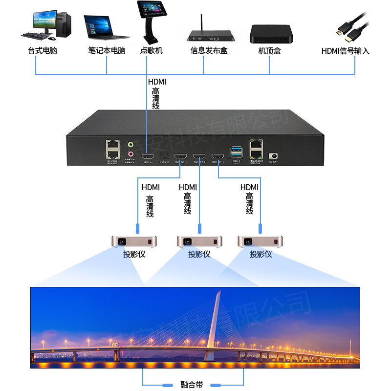 Triple-channel pure hardware projector fusion multiscreen splicing control edge processor software arched ring curtain 4K