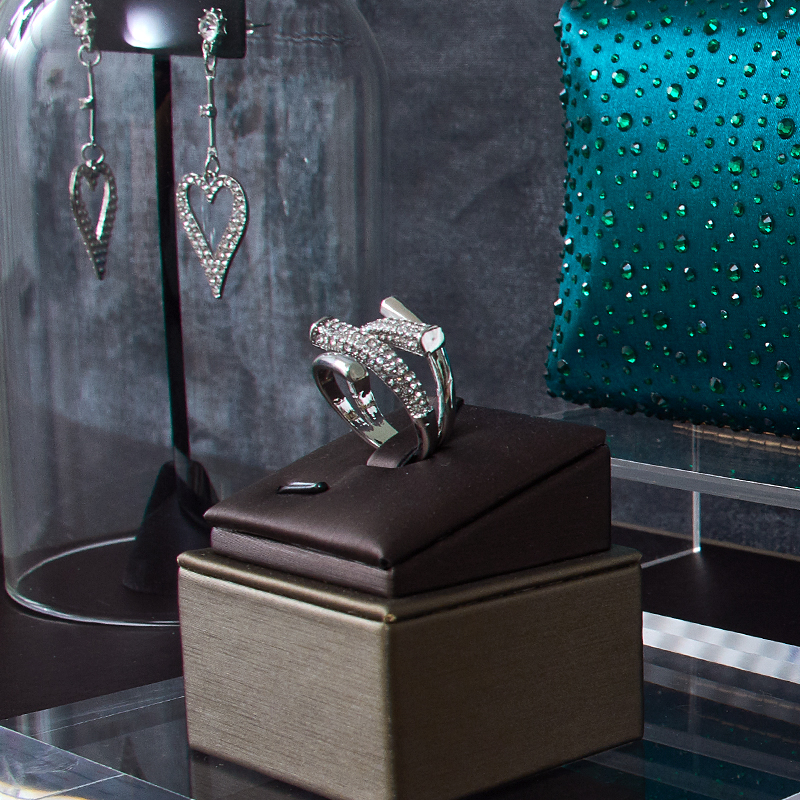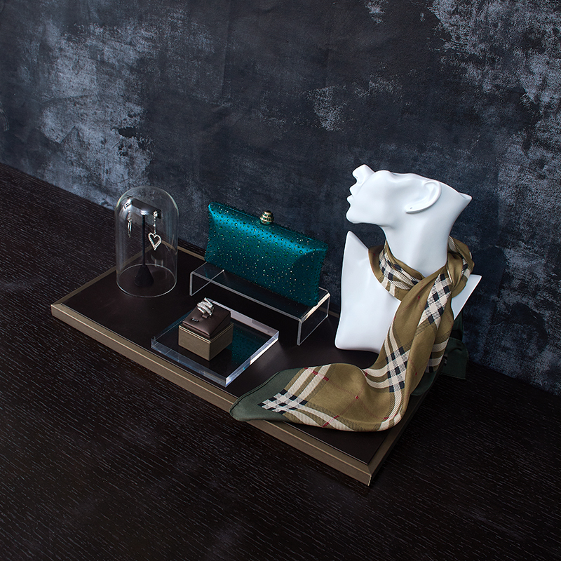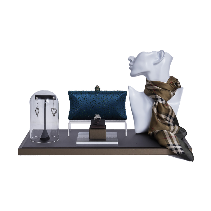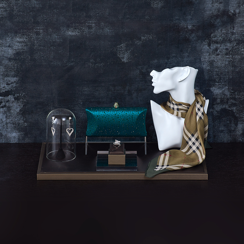 Cloakroom set 0027 desktop ornaments small glass cover European and American mix and match heart-shaped diamond long version earrings black flocking iron earring frame green rhinestone handbag transparent acrylic U-shaped display stand transparent acrylic pad