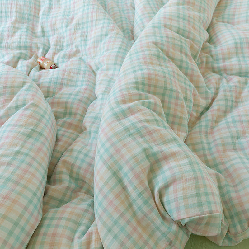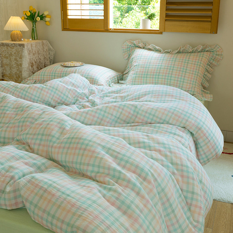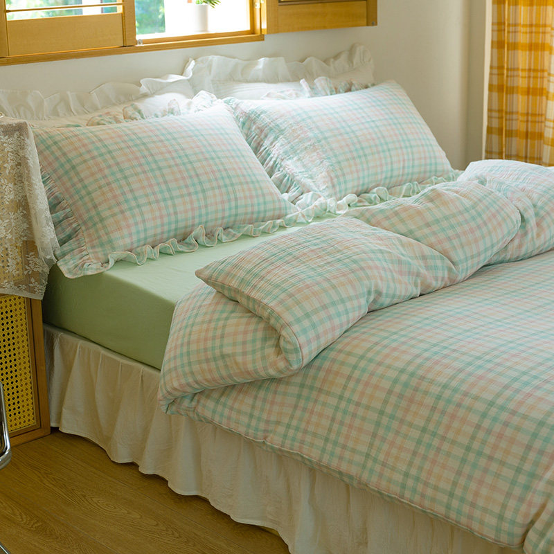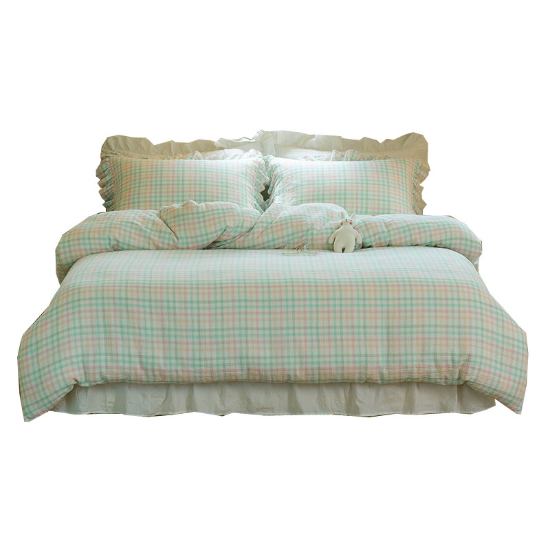Soft cotton yarn four-piece set of cotton double yarn Korean color plaid small fresh lace bedding