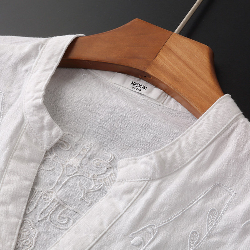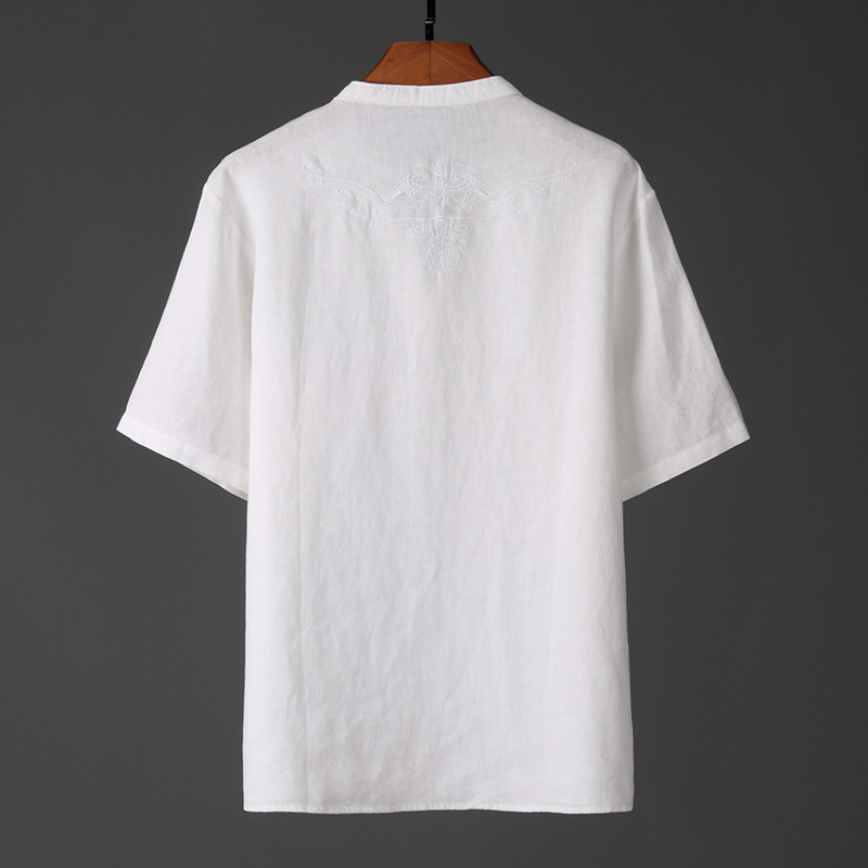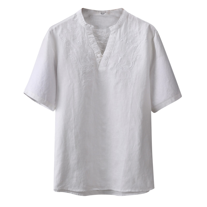 V collar disc buckle front and back embroidery pure linen short sleeve men's shirt loose casual pure hemp material numb shirt blouse E