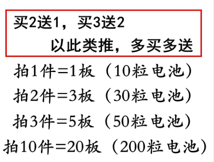 Take 1 piece of 10 batteries, take 2 get 1 free, and so on