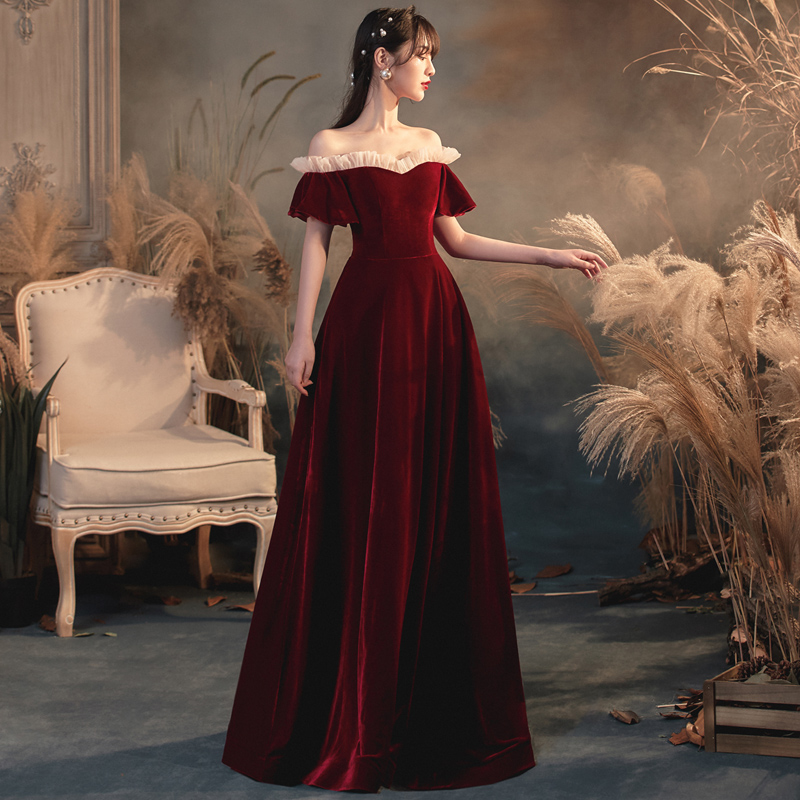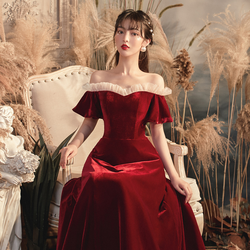 Toast wine red new 202021 word shoulder thin wedding engagement back door temperament velvet evening dress skirt
