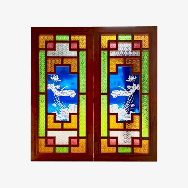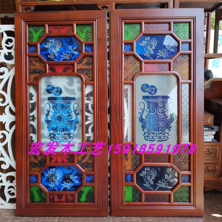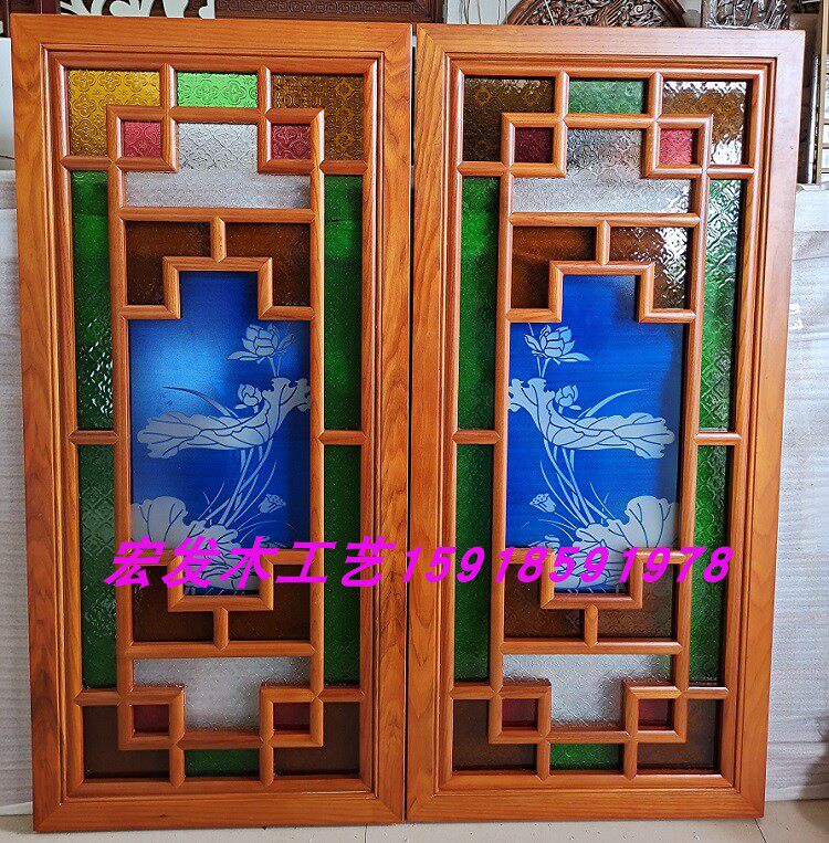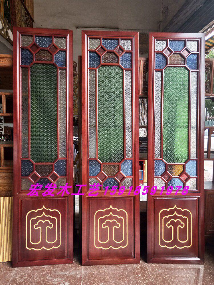 Lingnan Xiguan Manzhou window Cantonese style antique solid wood lattice wall Begonia color embossed art glass screen